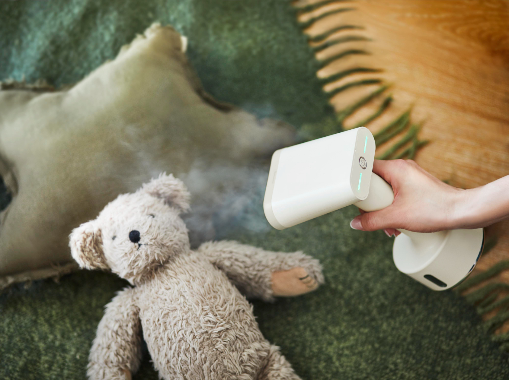 シワもニオイもさっとオフ!「軽い」「パワフル」「すぐ使える」の3拍子がそろった毎日を整える衣類スチーマーです。衣類だけでなく、ソファ、ラグマット、カーテン、ぬいぐるみなど、普段なかなか洗えないインテリアも、サッとひと吹きするだけで簡単にケアすることができます。