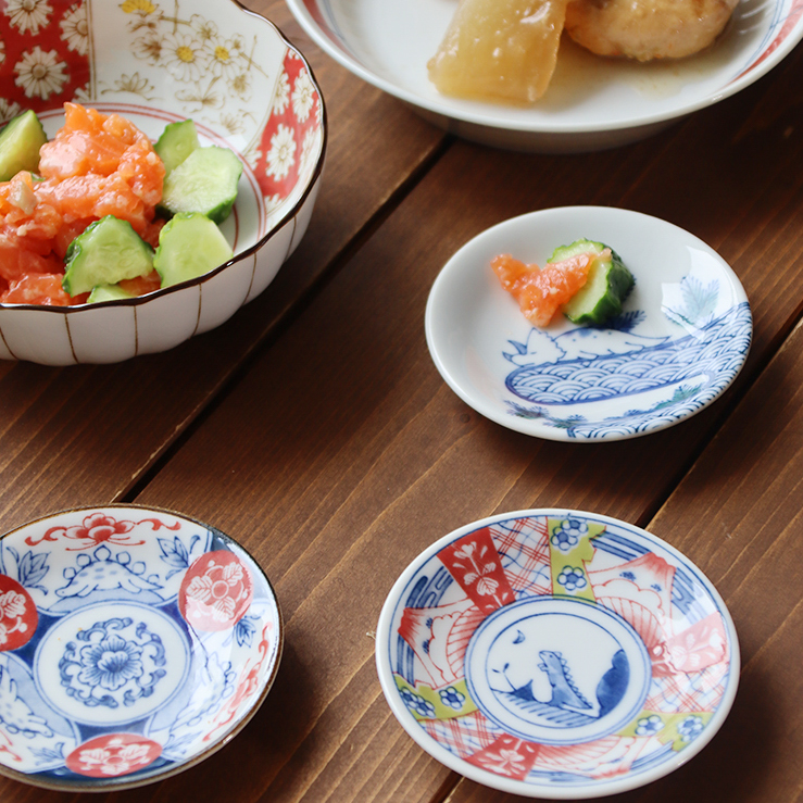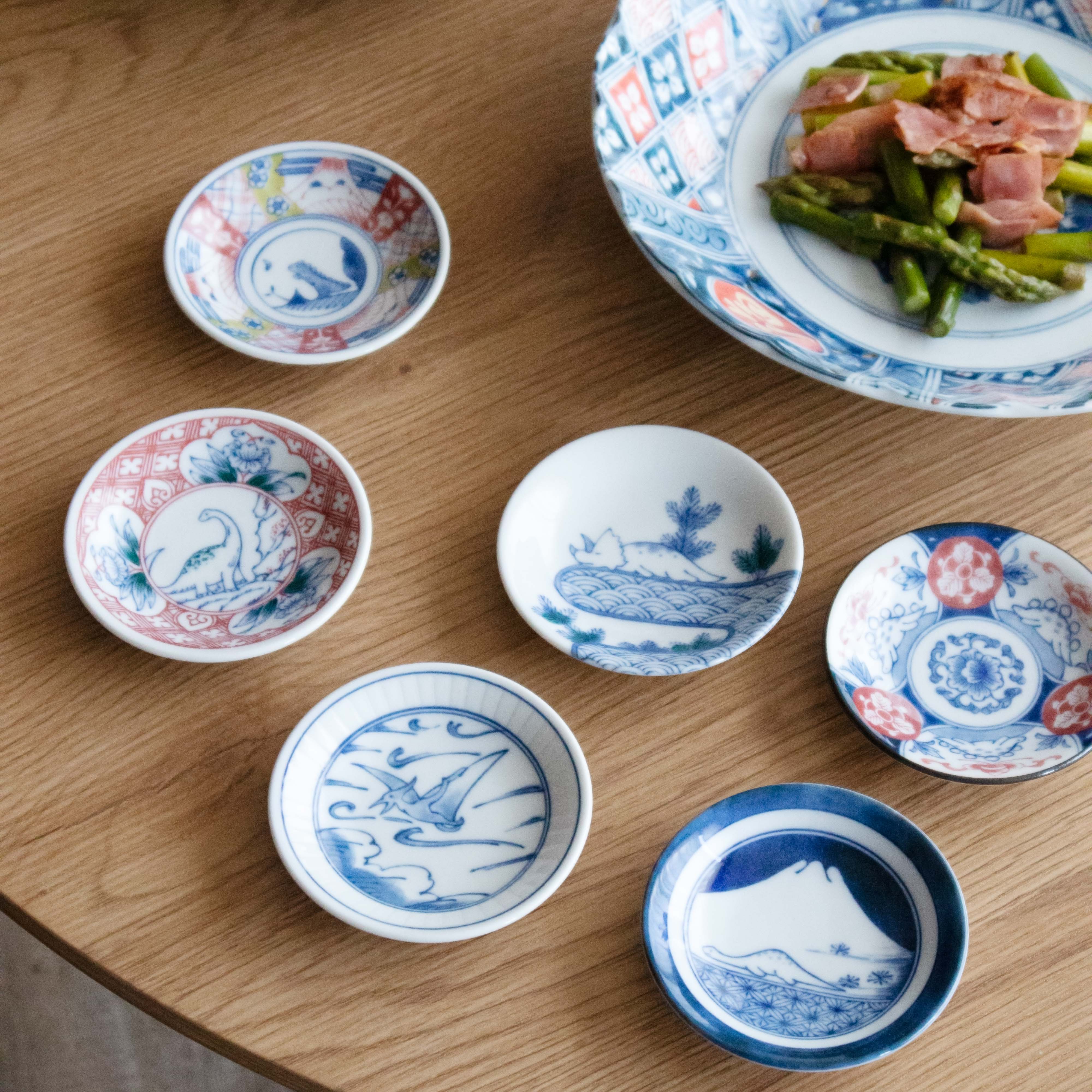 古典柄に可愛らしい恐竜たちが描かれたまめ皿が集まりました。どの恐竜がいるのかを楽しみながら選んで使える、華やかなまめ皿のセットです。