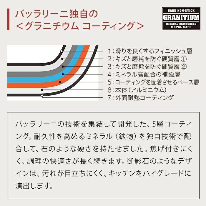耐摩耗に優れ、こびりつきにくい「グラニチウム エクストリームコーティング」。 IH・ガス火に対応。