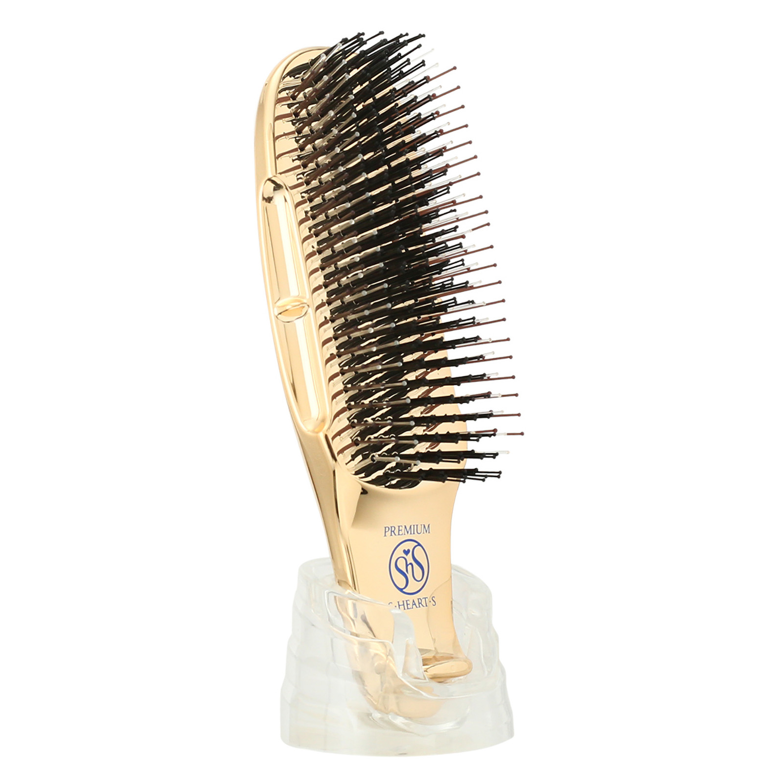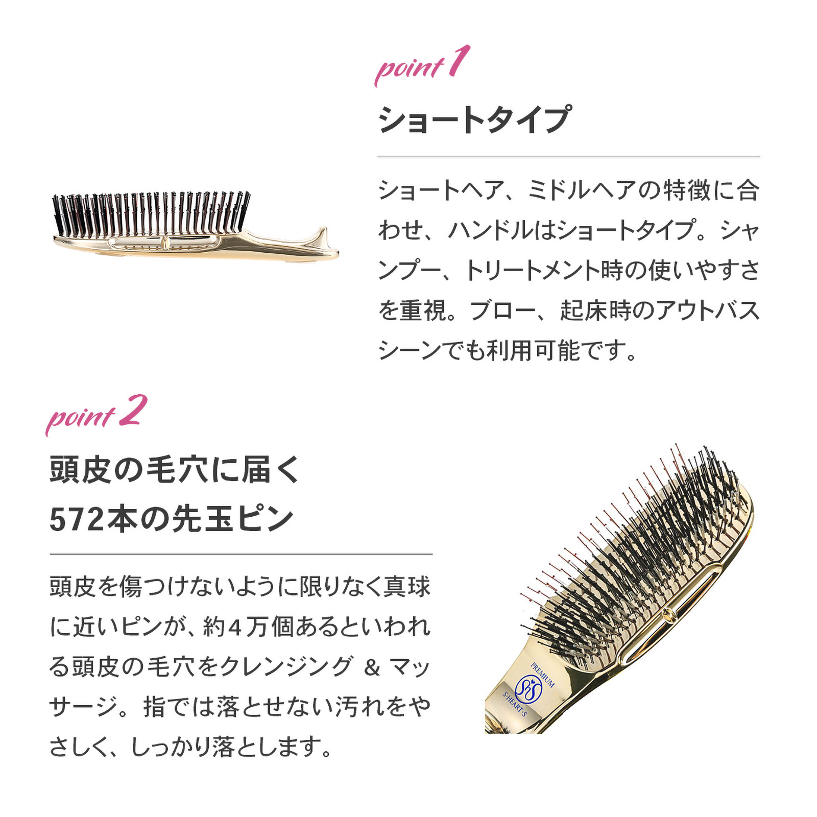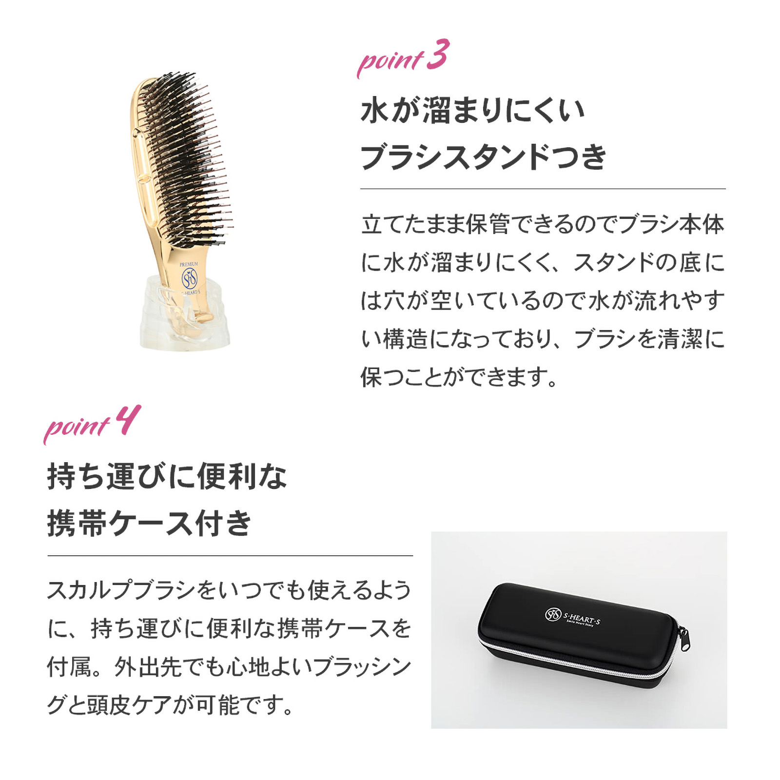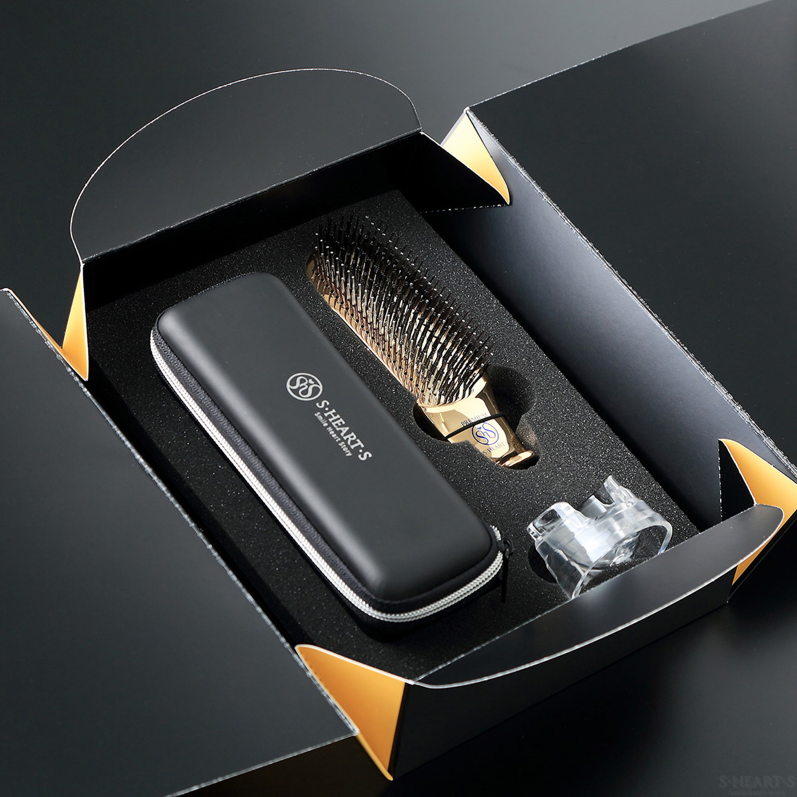 S・HEART・S人気No.1のワールドプレミアムに、ブラシスタンドと専用ケースを組み合わせた贅沢なギフトセット。高級感あふれるボックスに丁寧に収められています。持ちやすいショートサイズで、頭皮にしっかり密着し絶妙な心地よさを実感できます。