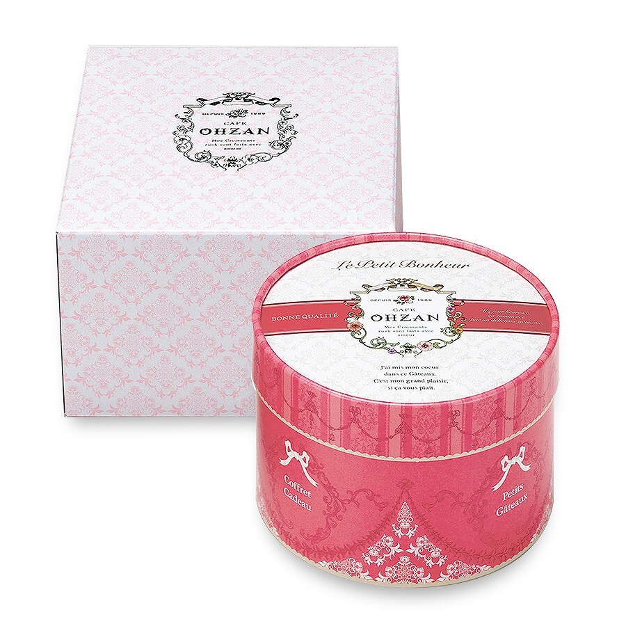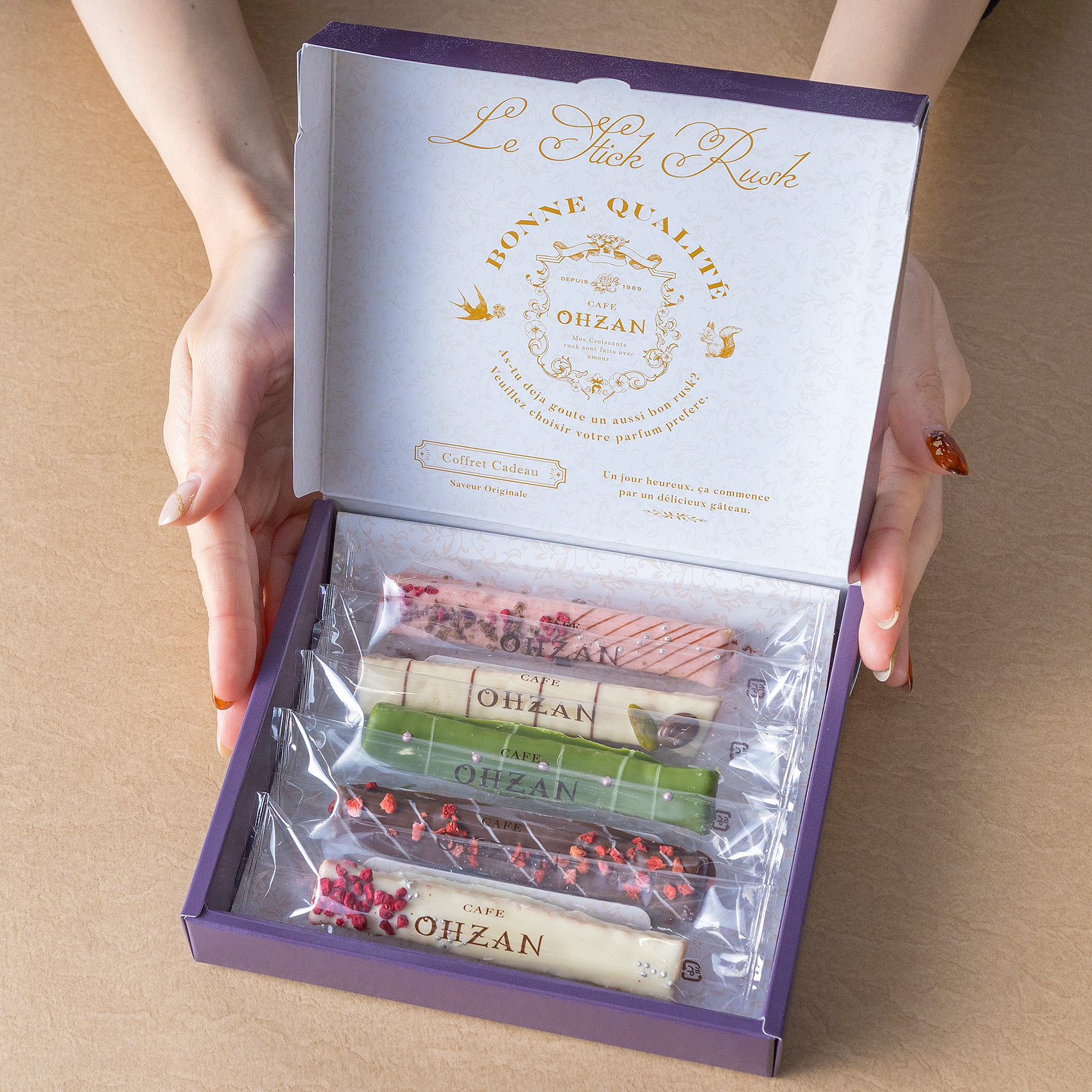 CAFE OHZANのブランドロゴと花をあしらった、華やかさと高級感のあるデザインです。ブランドロゴが入った外箱の中に筒状の素敵なパッケージが入っています。