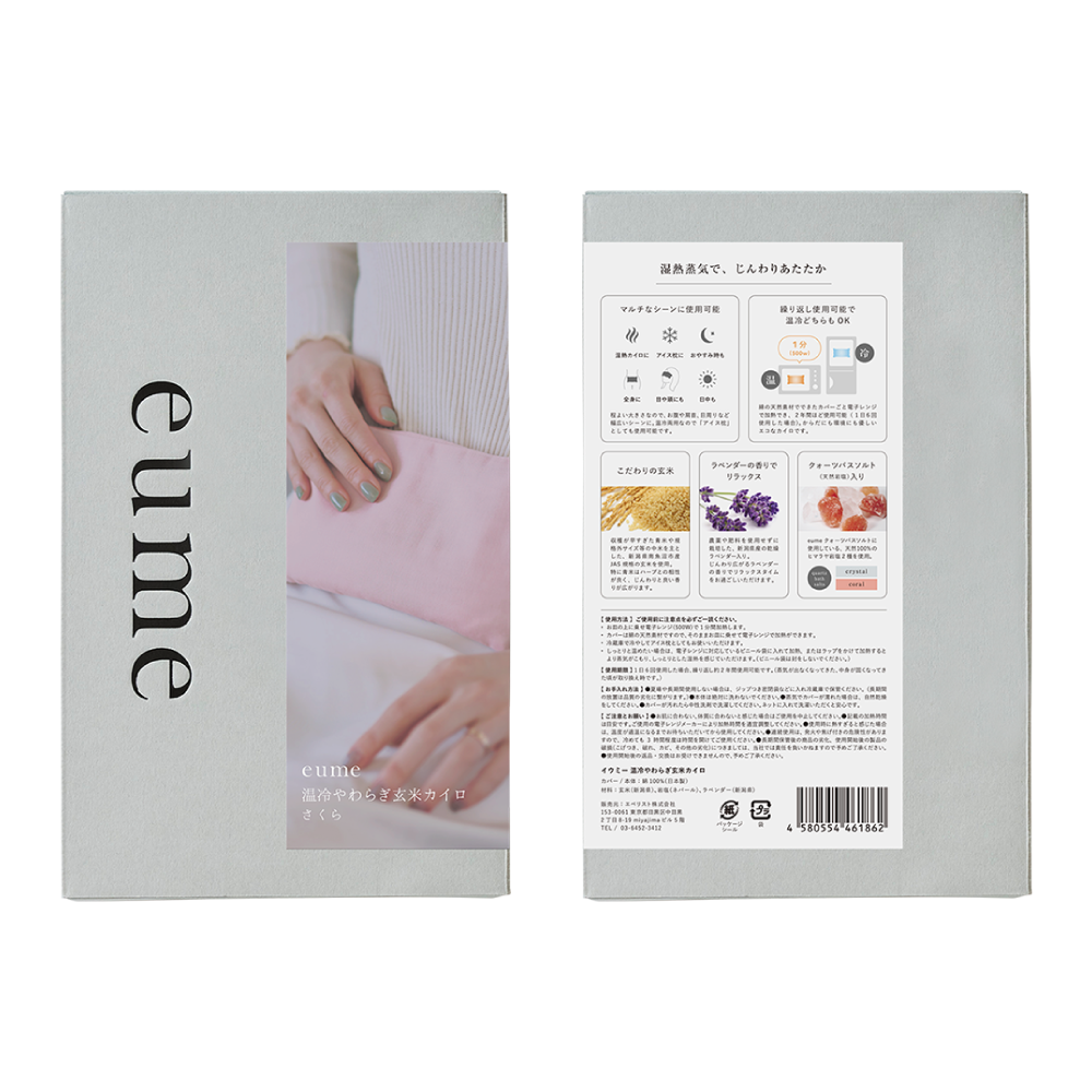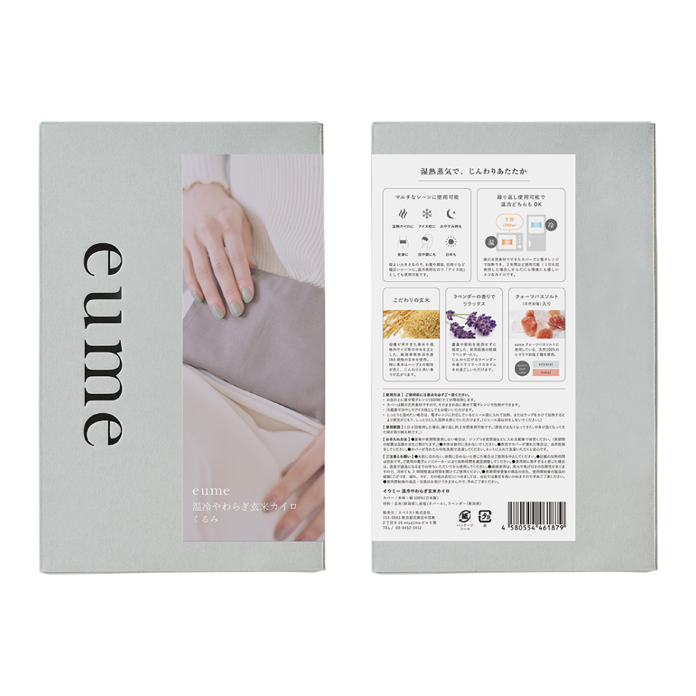 原料には、新潟県産の玄米とラベンダー、eumeクォーツバスソルトに使用している天然100%のヒマラヤ岩塩2種を配合。 カバーも天然素材でできているため、丸ごと電子レンジで加熱ができ、2年間ほど繰り返しお使いいただけます。 夏場は冷蔵庫で冷やして、アイス枕としても使用可能です。