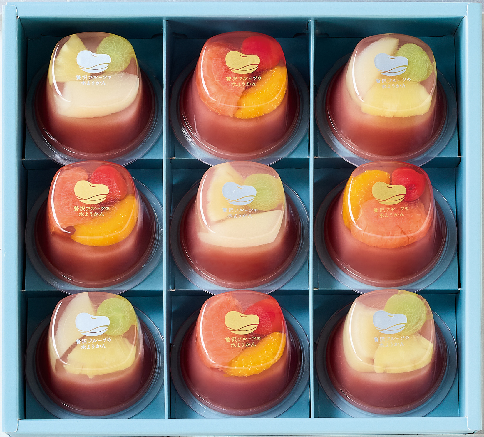 | 原材料 | 【ぶどう&白桃&パイナップル】 こしあん(国内製造)、砂糖、白桃シロップ漬、ぶどうシロップ漬、パイナップルシロップ漬、還元水飴、水あめ混合異性化液糖、寒天、食塩/安定剤(加工デンプン)、甘味料(ソルビトール)、ph調整剤、ゲル化剤(増粘多糖類)、酸味料、乳酸カルシウム、酸化防止剤(V.C)、香料、(一部にももを含む) 【さくらんぼ&ピンクグレープフルーツ&みかん】 こしあん(国内製造)、砂糖、グレープフルーツシロップ漬、さくらんぼシロップ漬、みかんシロップ漬、還元水飴、水あめ混合異性化液糖、寒天、食塩/安定剤(加工デンプン)、甘味料(ソルビトール)、ph調整剤、ゲル化剤(増粘多糖類)、酸味料、酸化防止剤(V.C)、乳酸カルシウム、香料、着色料(ラック) |