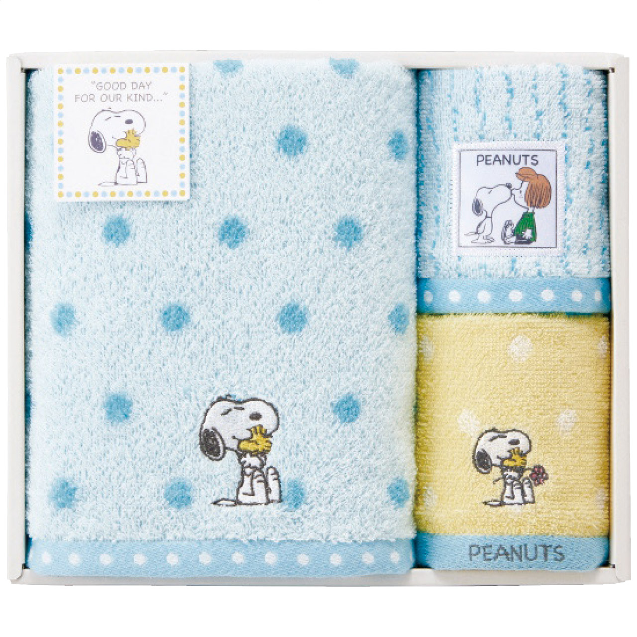 大口注文・法人のお問い合わせはこちらPEANUTSからハグをテーマに、スヌーピーが仲間に寄り添うシーンをモチーフにしました。ハグするスヌーピーから優しさや思いやりが伝わるデザインです。 バスタオル1枚、ウォッシュタオル2枚が入っています。 ※画像はイメージです。