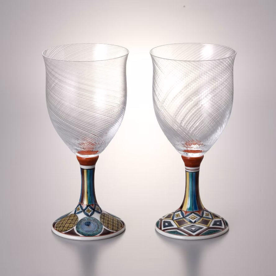 昭和39年創業の「清峰堂」代表的な「九谷和グラス」シリーズから、ワイングラス大(斜)ペアセットをお届け。脚部分のデザインは、360年前の九谷焼創始の古九谷を現代風に再現した古九谷文様です。