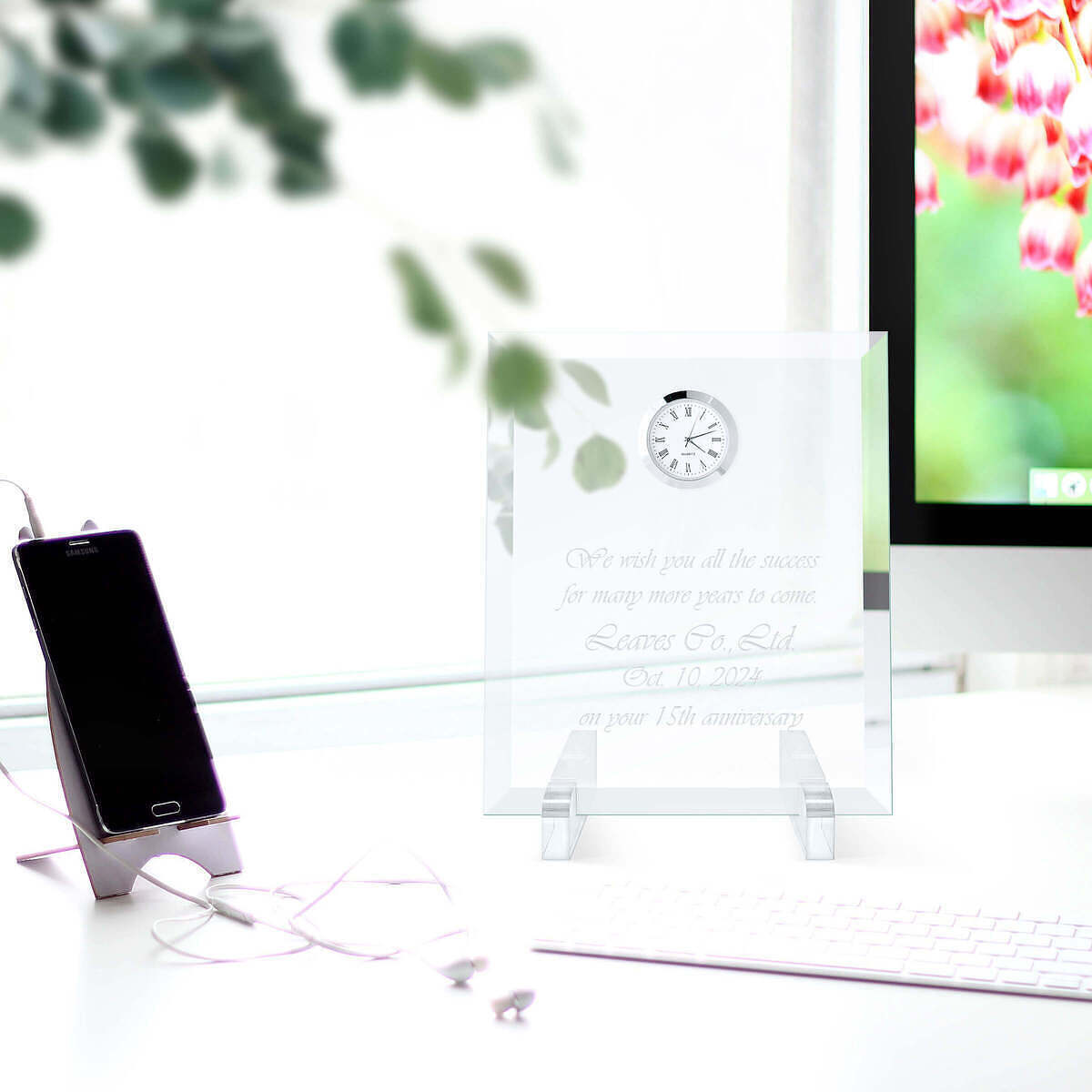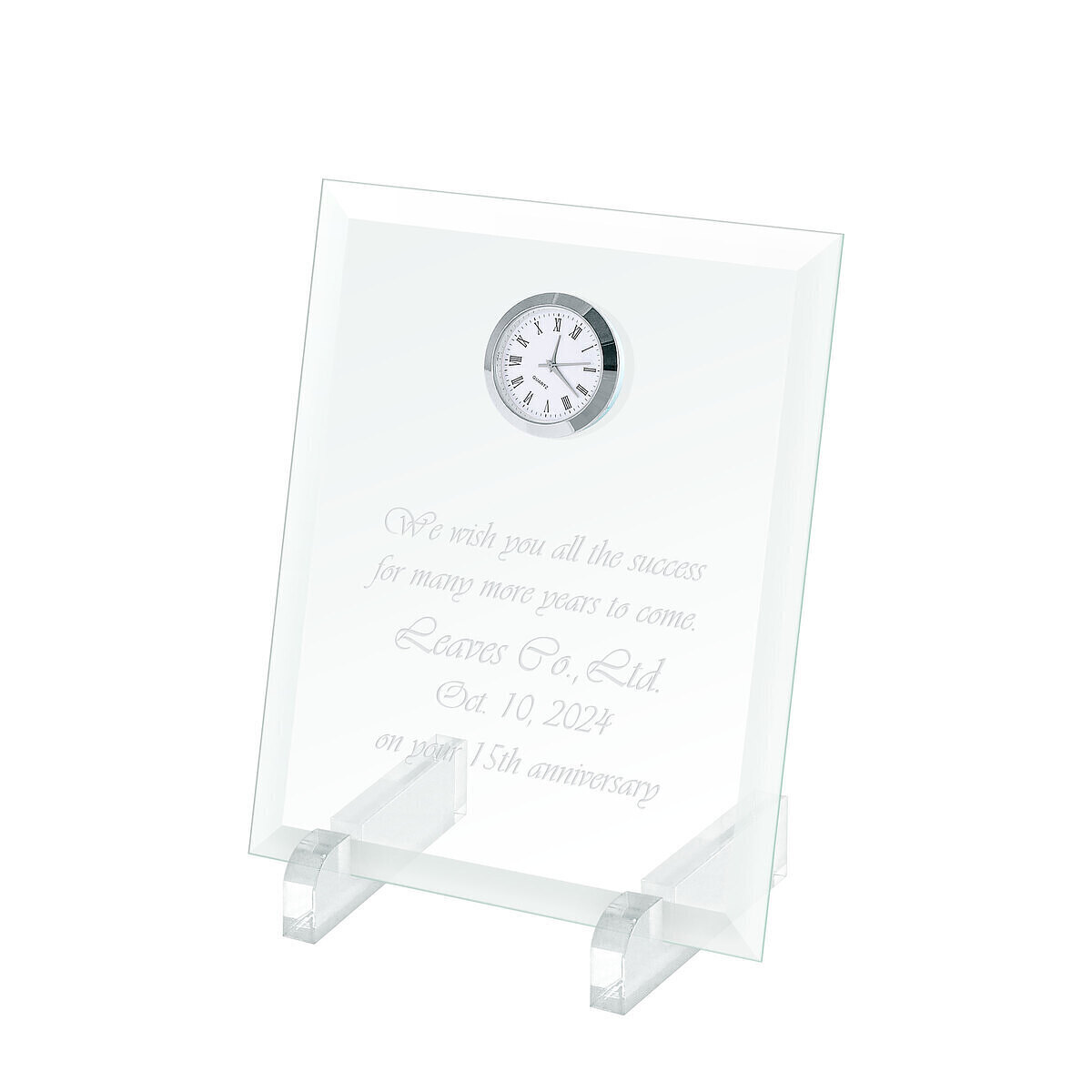 大口注文・法人のお問い合わせはこちら時計付きのシンプルなガラスプレート。 表彰状や認定証賞状など優れた成績や功績を称える証として。また、家族やお世話になった恩師への感謝状としても人気です。