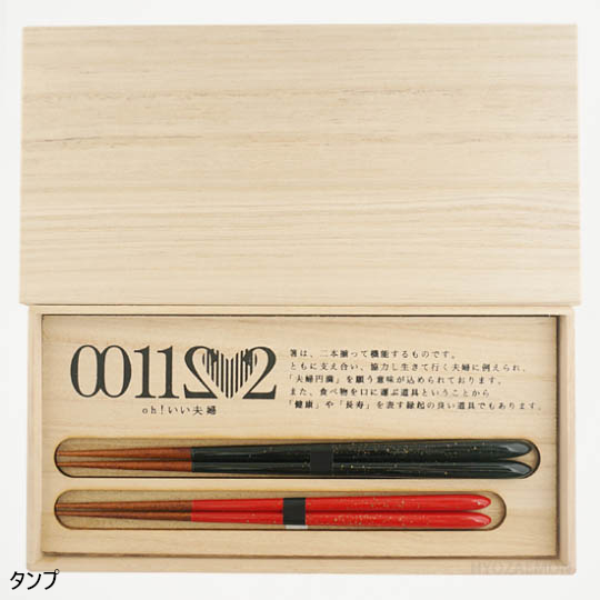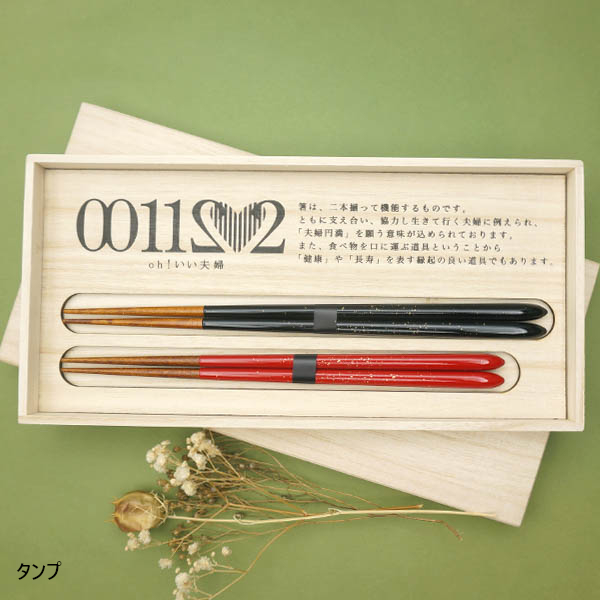 11月22日「いい夫婦の日」にちなんだ数字をロゴにした、リーズナブルで気軽に贈りやすいギフト。ご結婚祝いはもちろん、結婚記念日の品としても、通年でお求めいただいております。 【中板のメッセージ】 箸は、二本揃って機能するものです。 ともに支えあい、協力し生きて行く夫婦に例えられ、 「夫婦円満」を願う意味が込められております。 また、食べ物を口に運ぶ道具ということから、 「健康」や「長寿」を表す縁起の良い道具でもあります。 ~おすすめのシーン~ 結婚祝い、退職祝い、結婚記念日、記念日、送別会、還暦祝い、長寿祝い