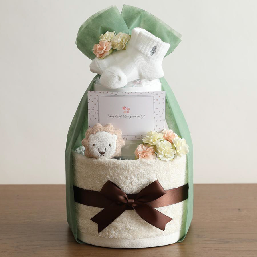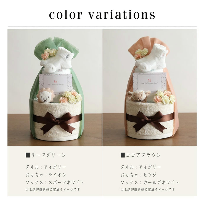 大口注文・法人のお問い合わせはこちら紙おむつ、今時タオル、おもちゃ、ラルフローレンベビーソックスがセットになった、おしゃれなおむつケーキです。 おむつケーキは「リーフグリーン」「ココアブラウン」「ハロウィン」「クリスマス」から、お好きなデザインをお選びいただけます。