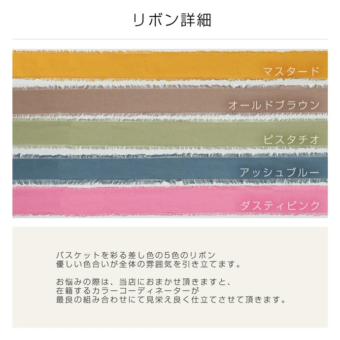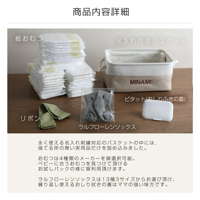 | セット内容 | ■紙おむつのメーカーと枚数 「パンパース」「ムーニー」「メリーズ」「GOO.N」 ※おむつのサイズはS,M,Lからお選びいただけます。 ★赤ちゃんの目安★ Sサイズ(4-8kg) Mサイズ(6-11kg) Lサイズ(9-14kg) ※衛生管理を徹底し、当店専属のおむつケーキマイスターが 1枚ずつ丁寧に個包装しておりますので安心してお使いいただけます ■おむつバスケット 本体カラーとリボンのカラーを御選択可能です。 ■バスケット本体 アッシュグレー ビスケット ピーチモカ スモーキーブルー オリーブ ■リボン ダスティピンク アッシュブルー マスタード ピスタチオ オールドブラウン ■上記バスケット本体・リボンカラーより、各1点御選択くださいませ。 ■本商品の装備アイテム ・ビタット(繰り返し使えるおしり拭きの蓋) ・メッセージカード ・ポロ ラルフローレン ベビーソックス ※サイズ 0~6か月(7~10cm) 6~12か月(9~12cm) 18~24か月(11~14cm) ※海外規格品となり、あくまで目安です。 |