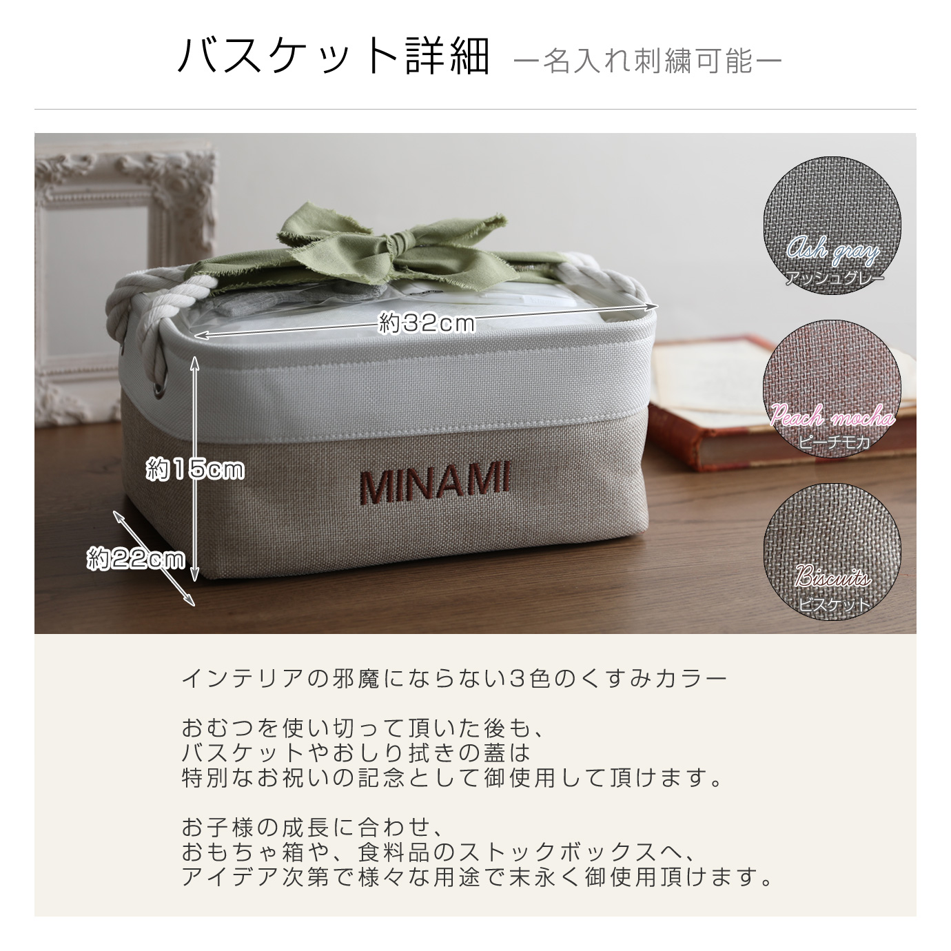 長く使える名入れ刺繍対応のバスケットの中には、捨てるところのない実用品だけを詰め込みました。特別なお祝いの記念におすすめです。