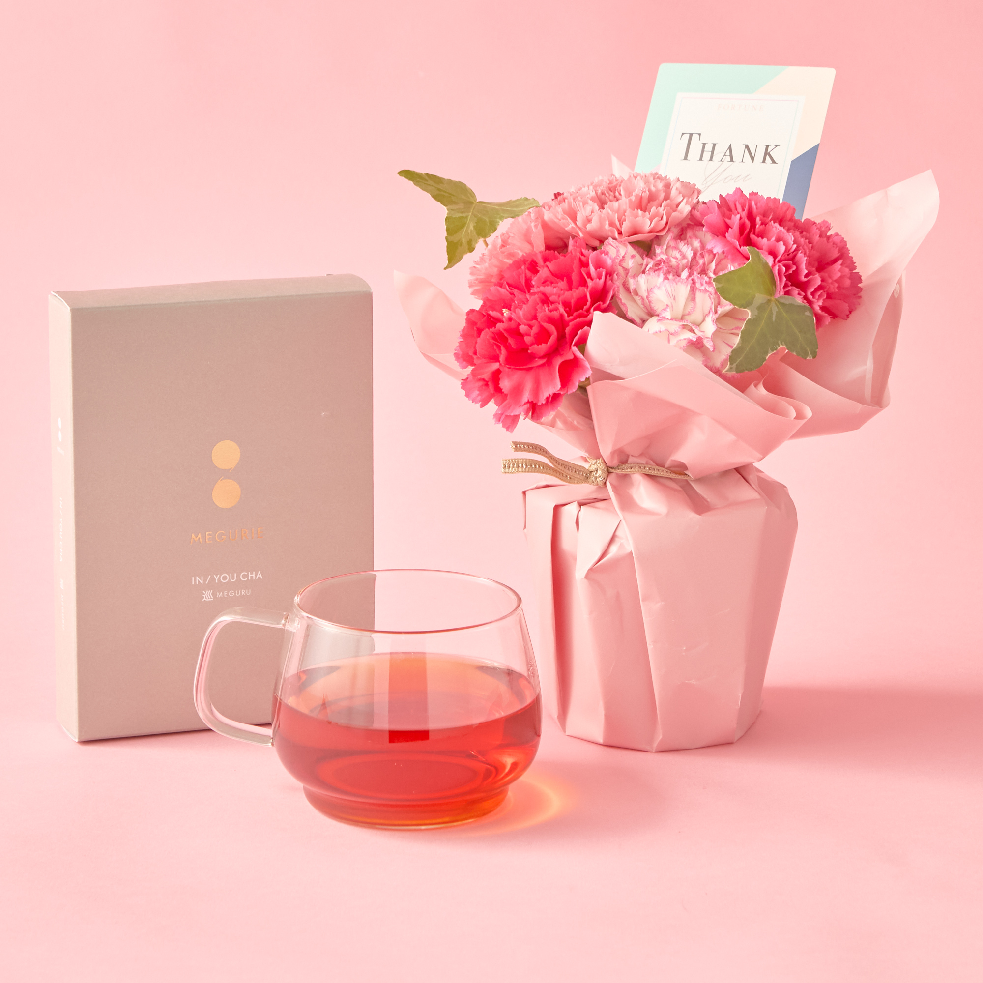 THANK youピックがアクセントで、ピンクを基調としたキュートなブーケと選べるドリンクのセット。普段なかなか言えない「ありがとう」の気持ちを、贈り物で伝えてみませんか。