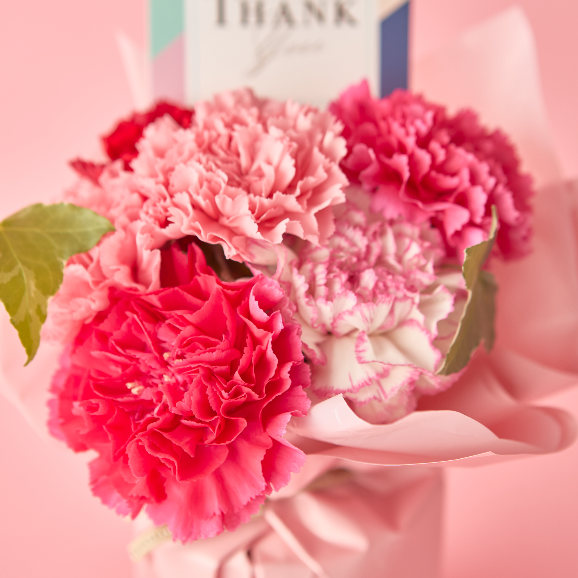 大口注文・法人のお問い合わせはこちら花瓶要らずで贈る方も贈られる方も気軽で、とても人気の高い商品です。 ピンクを基調としたキュートなブーケです。 THANK youピックがアクセント。かわいいテイストがお好みのお母さんへピッタリの商品です。 カラーリングを楽しむ&手軽に楽しむがキーワードの商品です。 環境に配慮したラッピングペーパーやピックを使用しています。