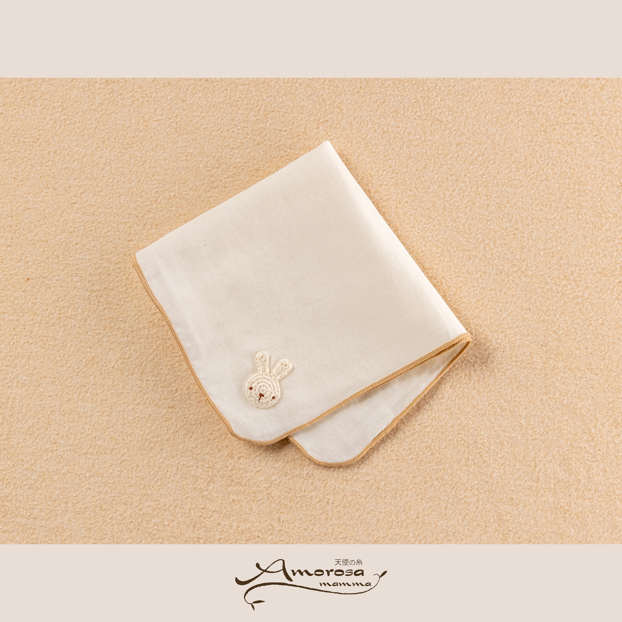 やわらかいダブルガーゼ生地にひとつひとつていねいに編まれたモチーフがついたガーゼハンカチ。 あかちゃんのお口ふきにもぴったりです。