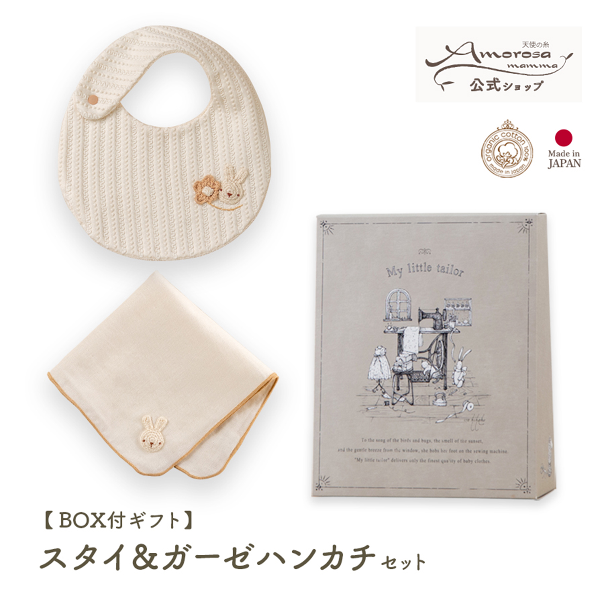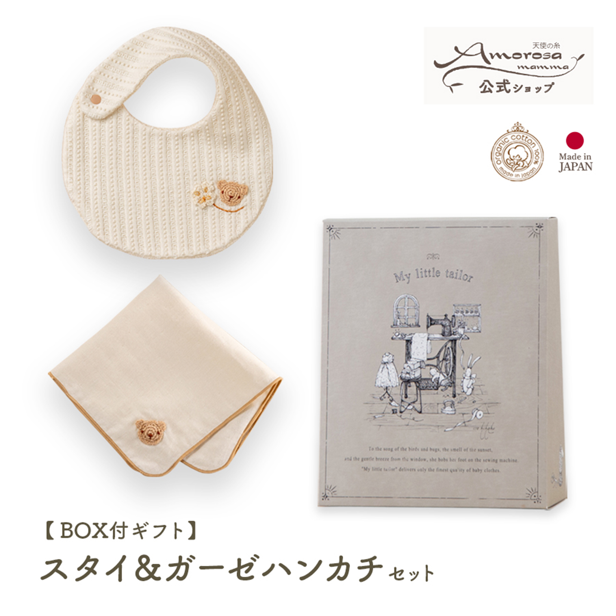 | 素材 | [スタイ/手編みくま・うさぎ] オーガニックコットン100% 表:レーシーニット 裏:シンカーパイル [ガーゼハンカチ/手編みくま・うさぎ] オーガニックコットン100% ダブルガーゼ |
