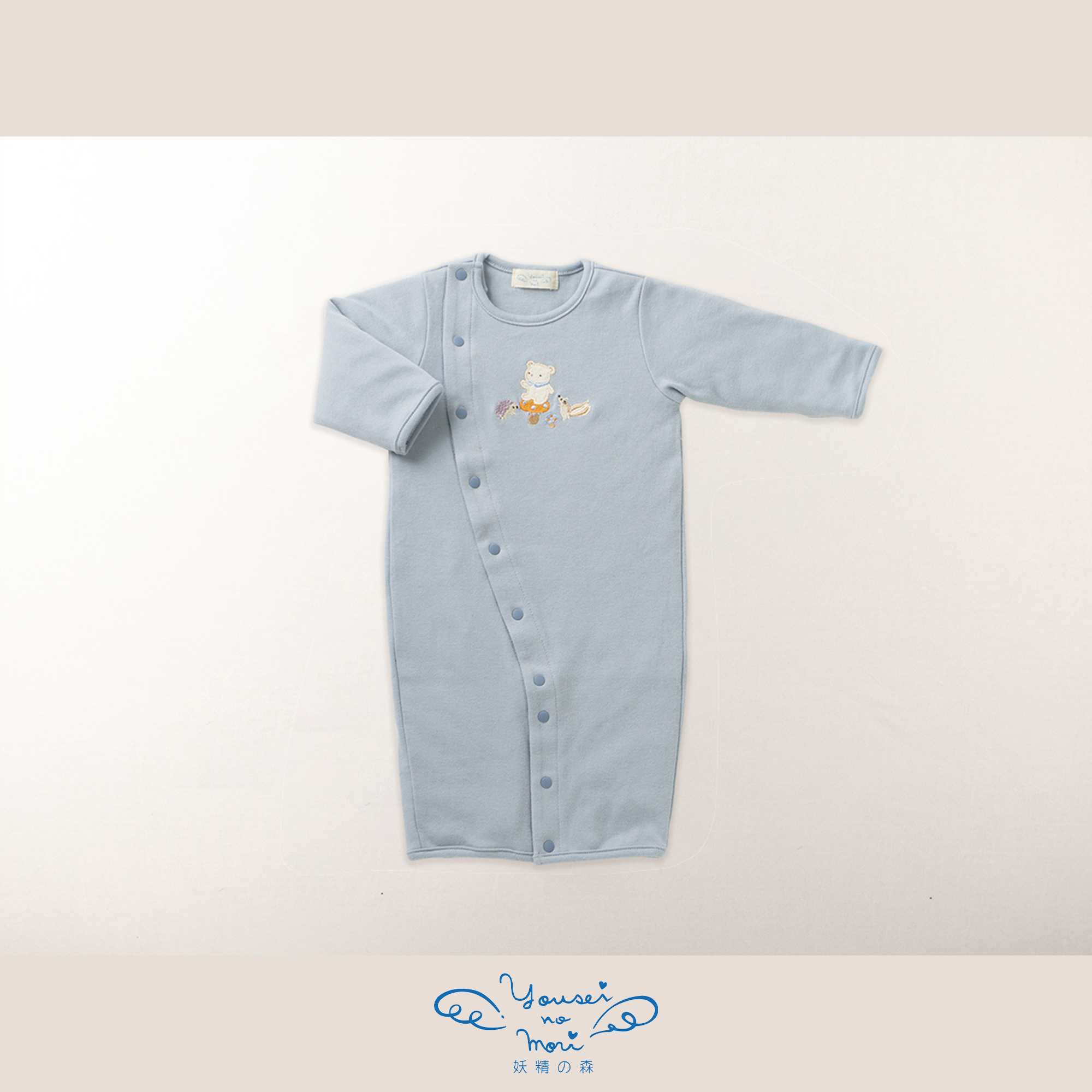 大口注文・法人のお問い合わせはこちら小さな森に住むクマさん刺しゅうは、人気のくすみカラーにぴったり。 2wayタイプのドレスは頻繁におむつ替えが必要な新生児のマストアイテムです。