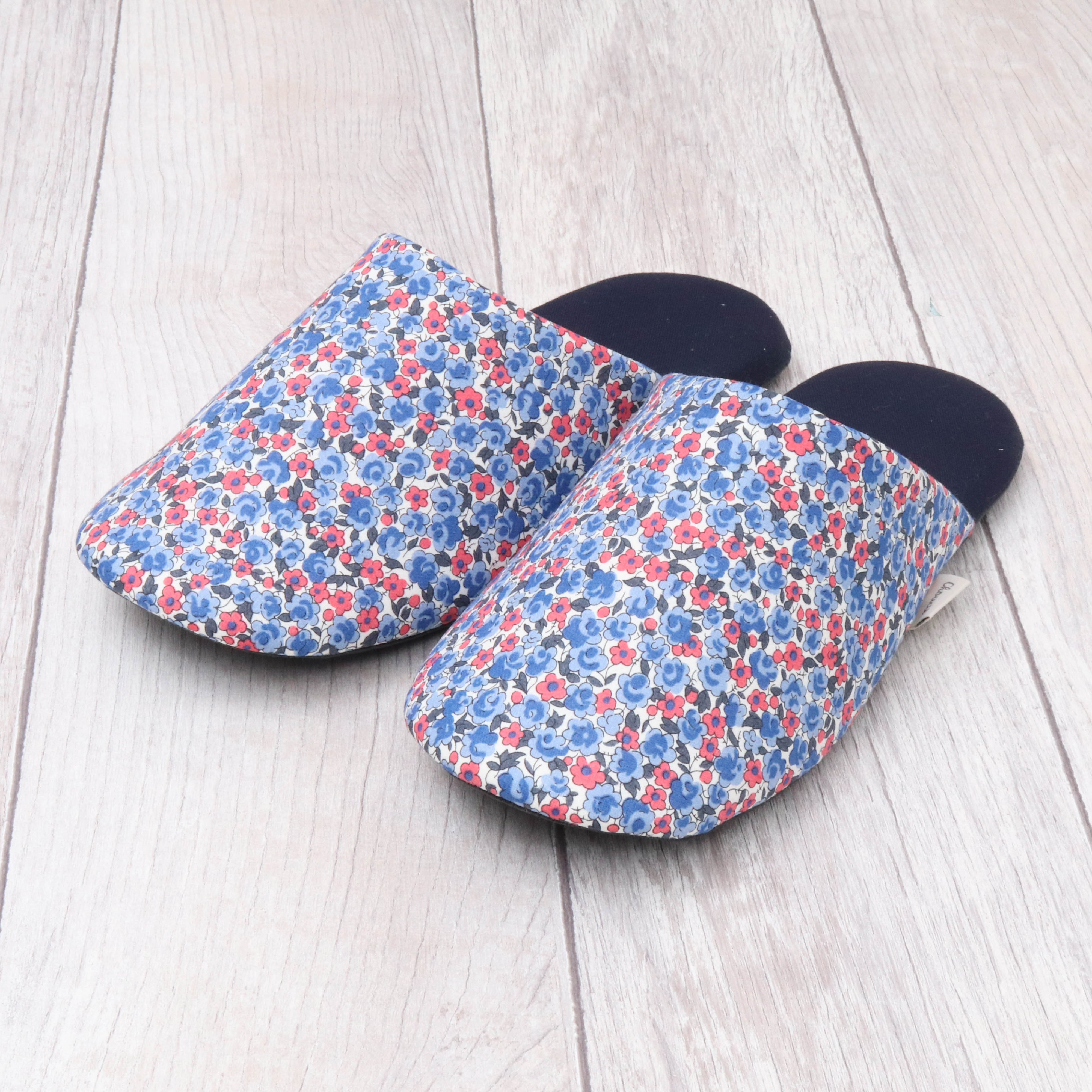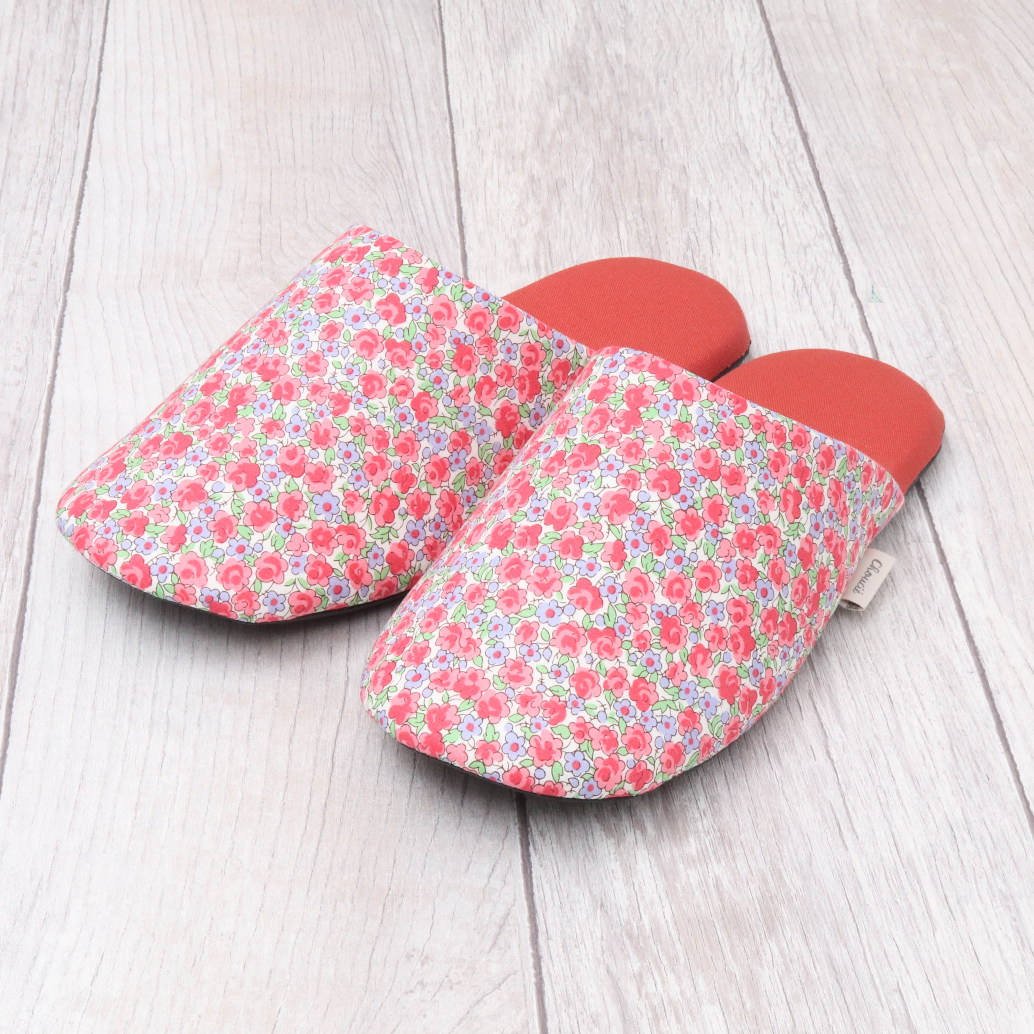 リバティプリントを施したオーガニックコットンを使用しており、インテリアに華やぎをプラスする上品で可愛らしいスリッパです。柄を最大限に生かすためにシンプルな形に仕上げました。