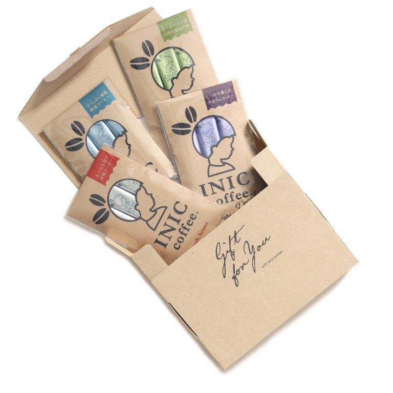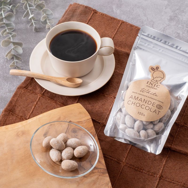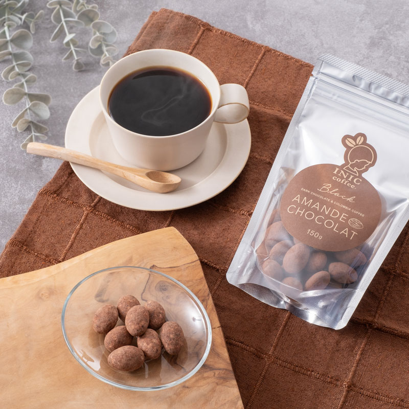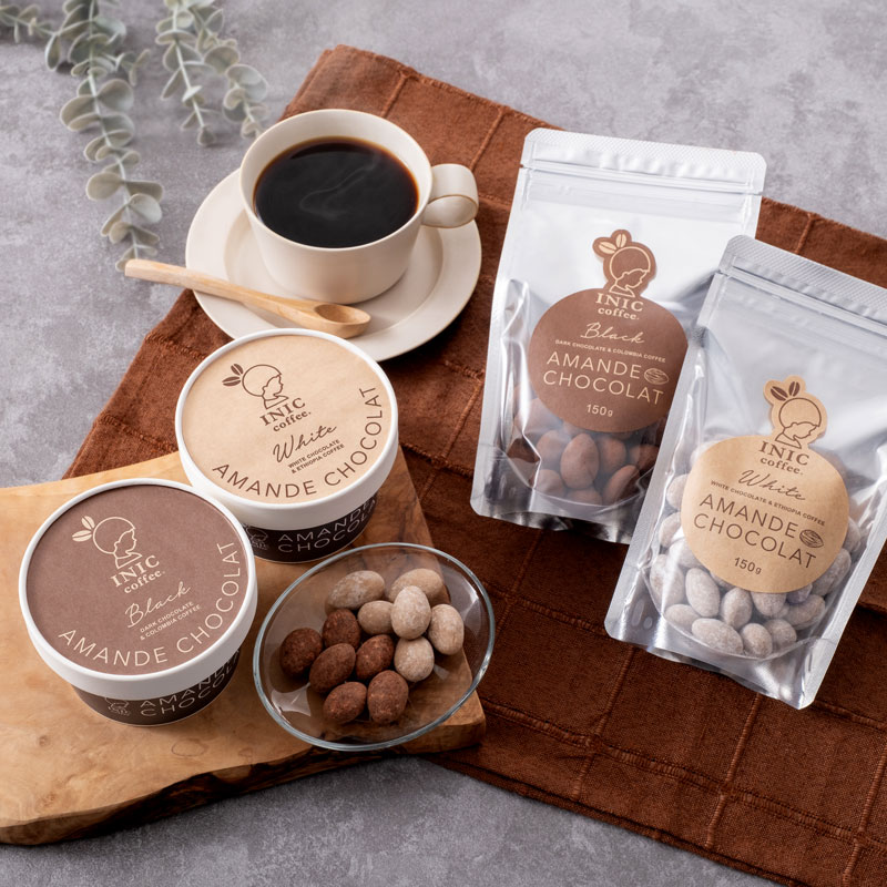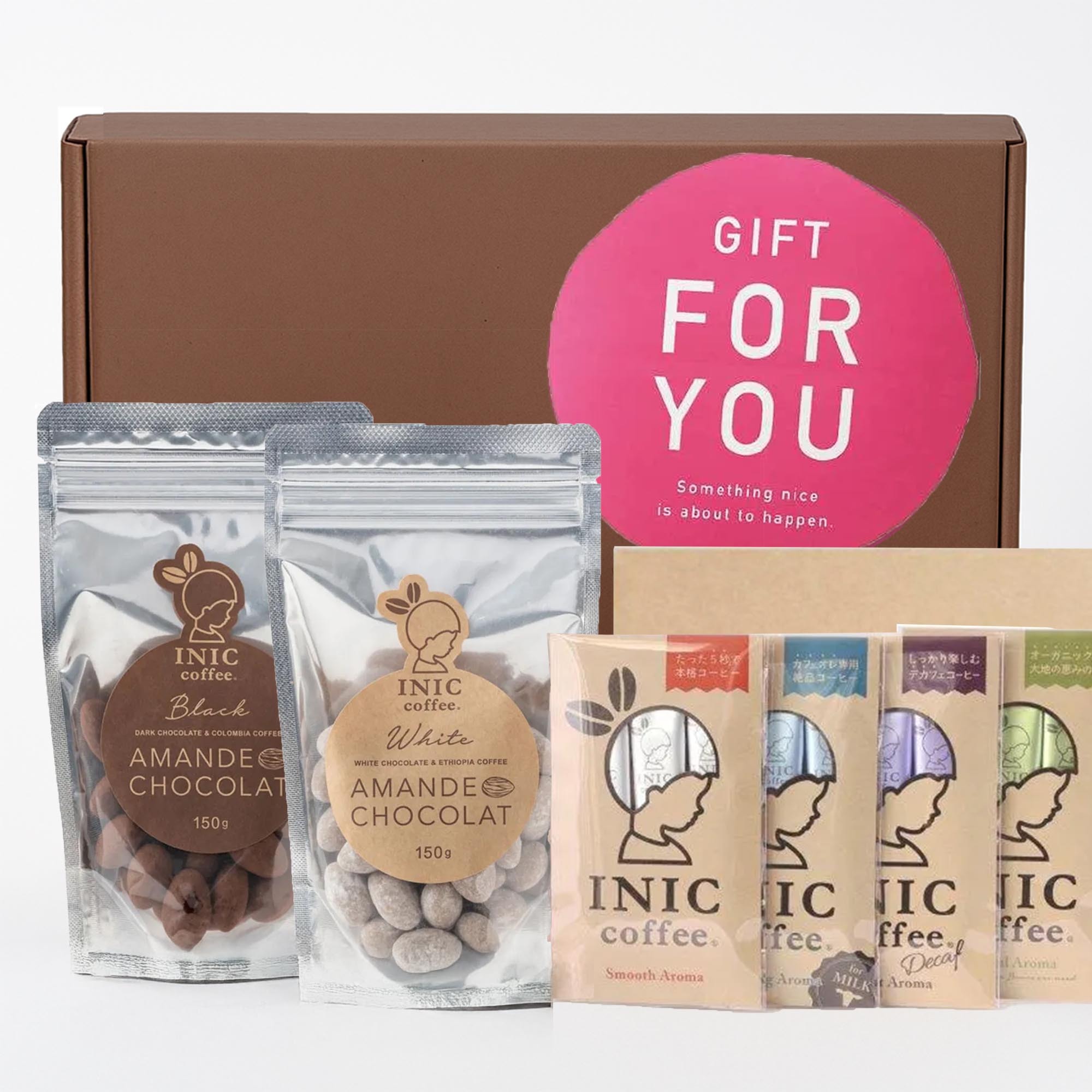 「INIC coffee」の人気のドリップド・コーヒーパウダー4種と、ローストやキャラメリゼしたアーモンドをチョコレートでコーティングしたお菓子、アマンドショコラのセットです。ボックス付きなので、そのままお相手の方にお渡しいただけます。