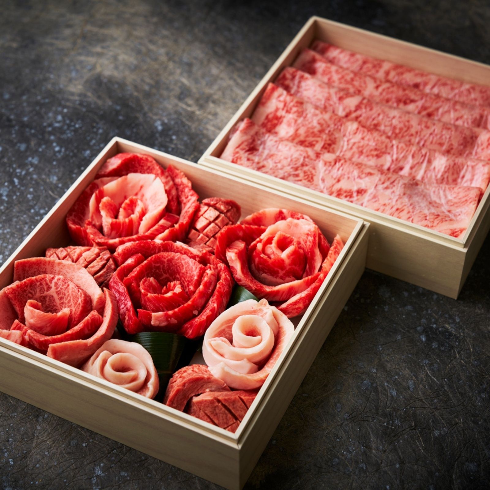 厳選した「黒毛和牛しゃぶしゃぶ」をプラスした豪華な2段セット。 【壱の重】内容量:600g ・上撰バラ 100g ・特選厚切り牛タン 100g ・トントロ 100g ・国産ロース 100g ・国産バラ 200g 【弐の重】 黒毛和牛しゃぶしゃぶ400g 黒毛和牛A4~A5ランクのみを使用。上品な脂の風味と肉の味わいが楽しめます。 【自家製秘伝のタレ】 ・あっさりタレ1本(80ml) ・甘口タレ1本(80ml) ・塩だれ30g