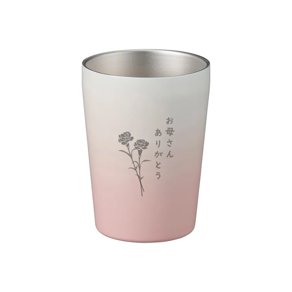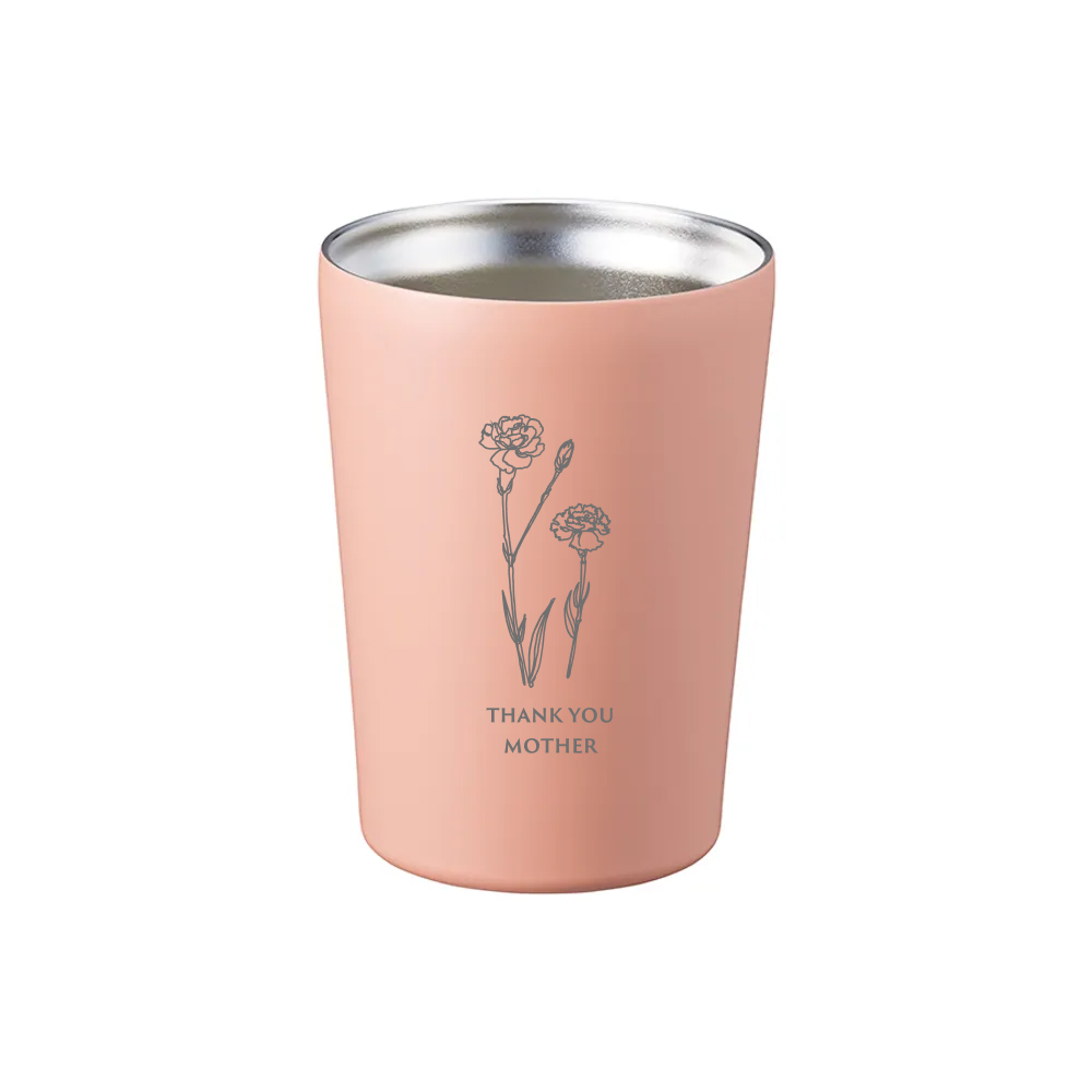 大切なお母さんに、日頃の感謝を素直に伝えられる母の日限定のタンブラーが登場。 やわらかなピンクカラーのタンブラーに、可憐なカーネーションの線画と「お母さんありがとう」の文字を刻印。 目に入るたび、あたたかな気持ちがよみがえる特別なデザインです。 ステンレス製で保温性もあり、温かい飲み物をゆっくり楽しめるのも嬉しいポイント。 使いやすいサイズで、日常使いにもぴったり。 見た目だけでなく、機能性もしっかり兼ね備えた、心も身体もほっとするギフトです。