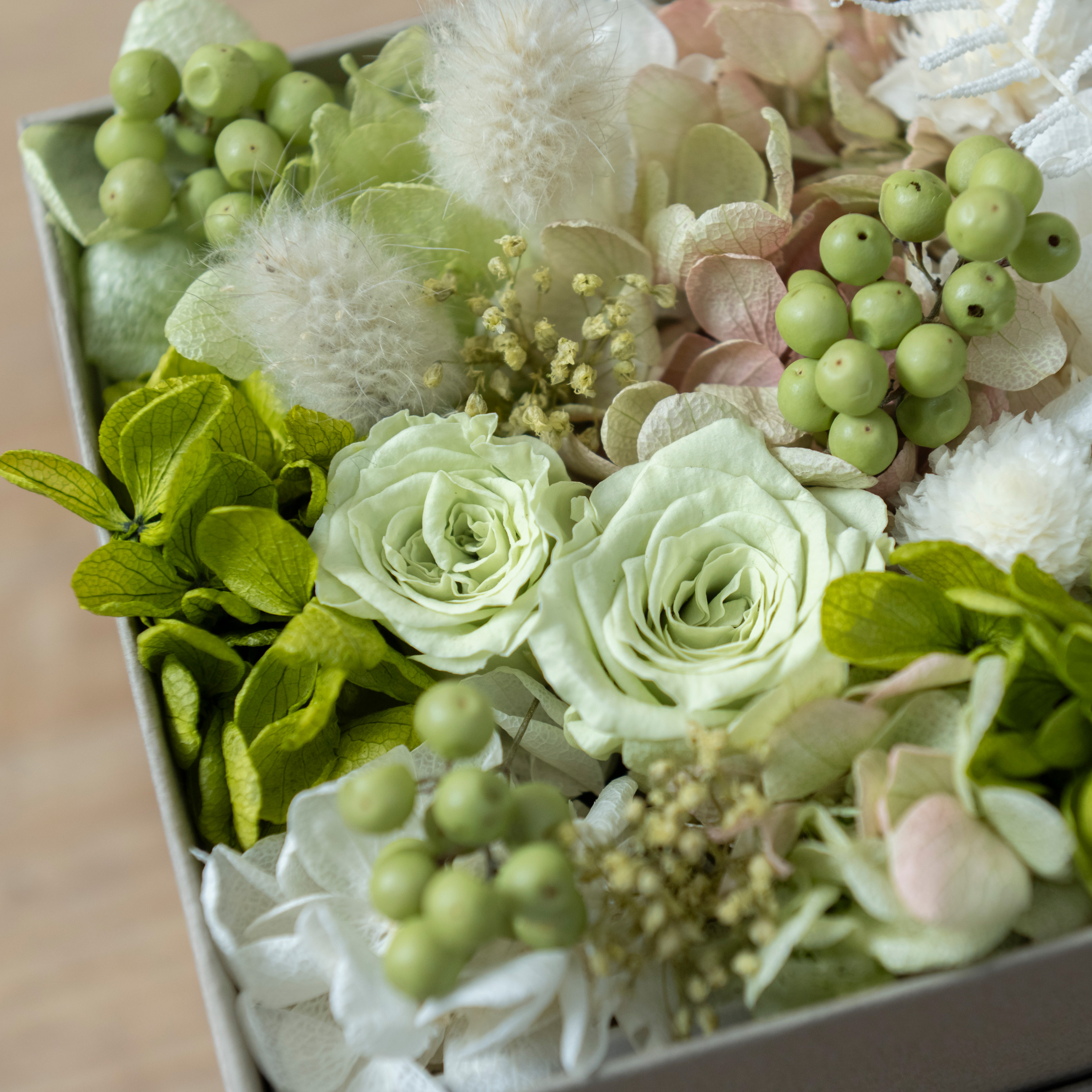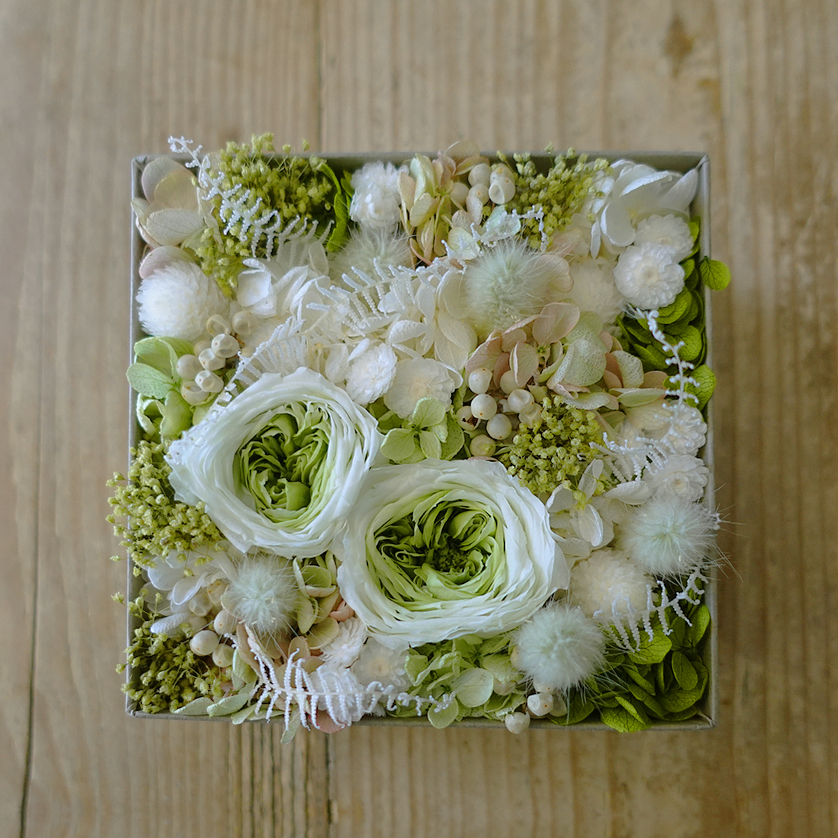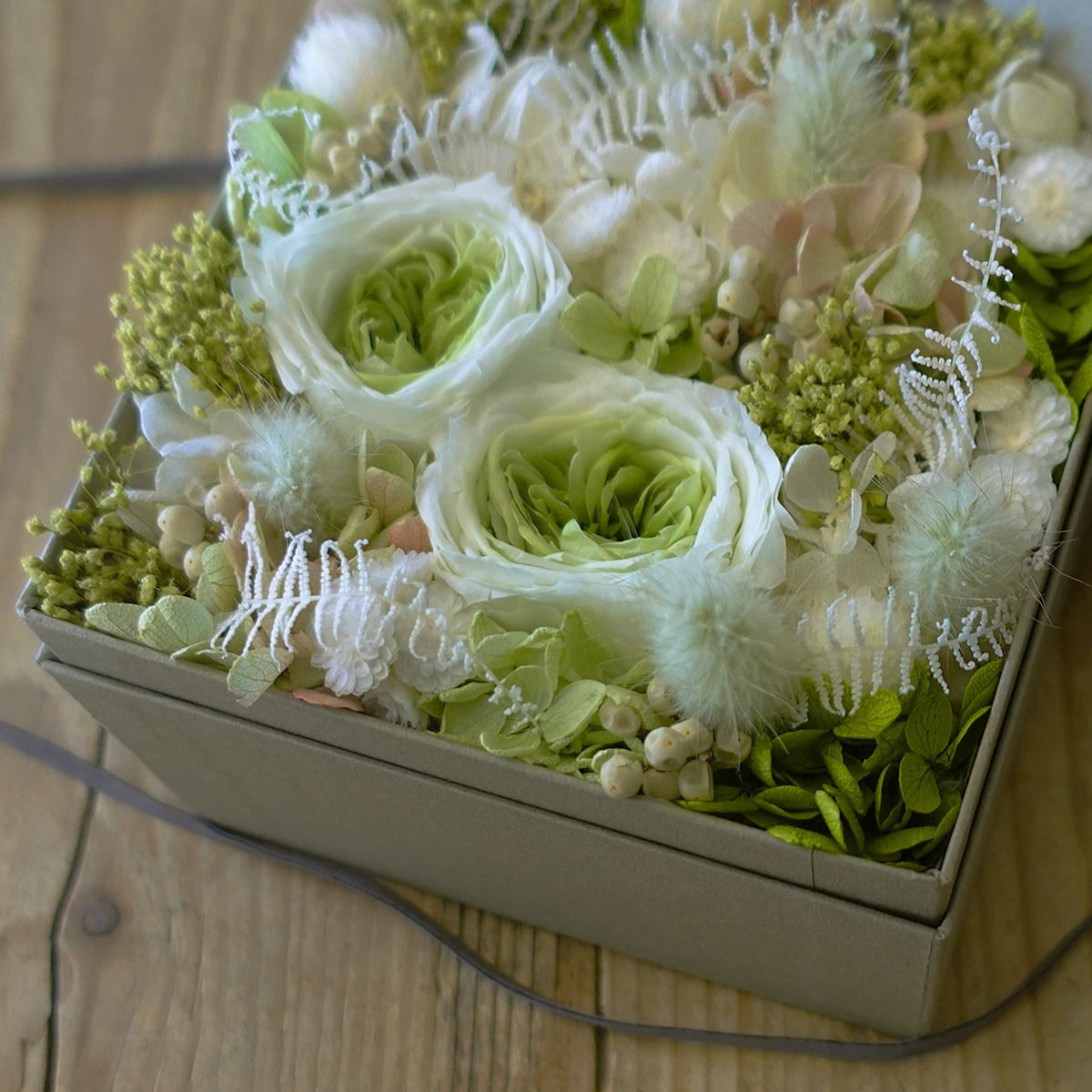 ホワイト&グリーンを基調に柔らかな色調でまとめたナチュラルテイストのプリザードフラワーボックスです。