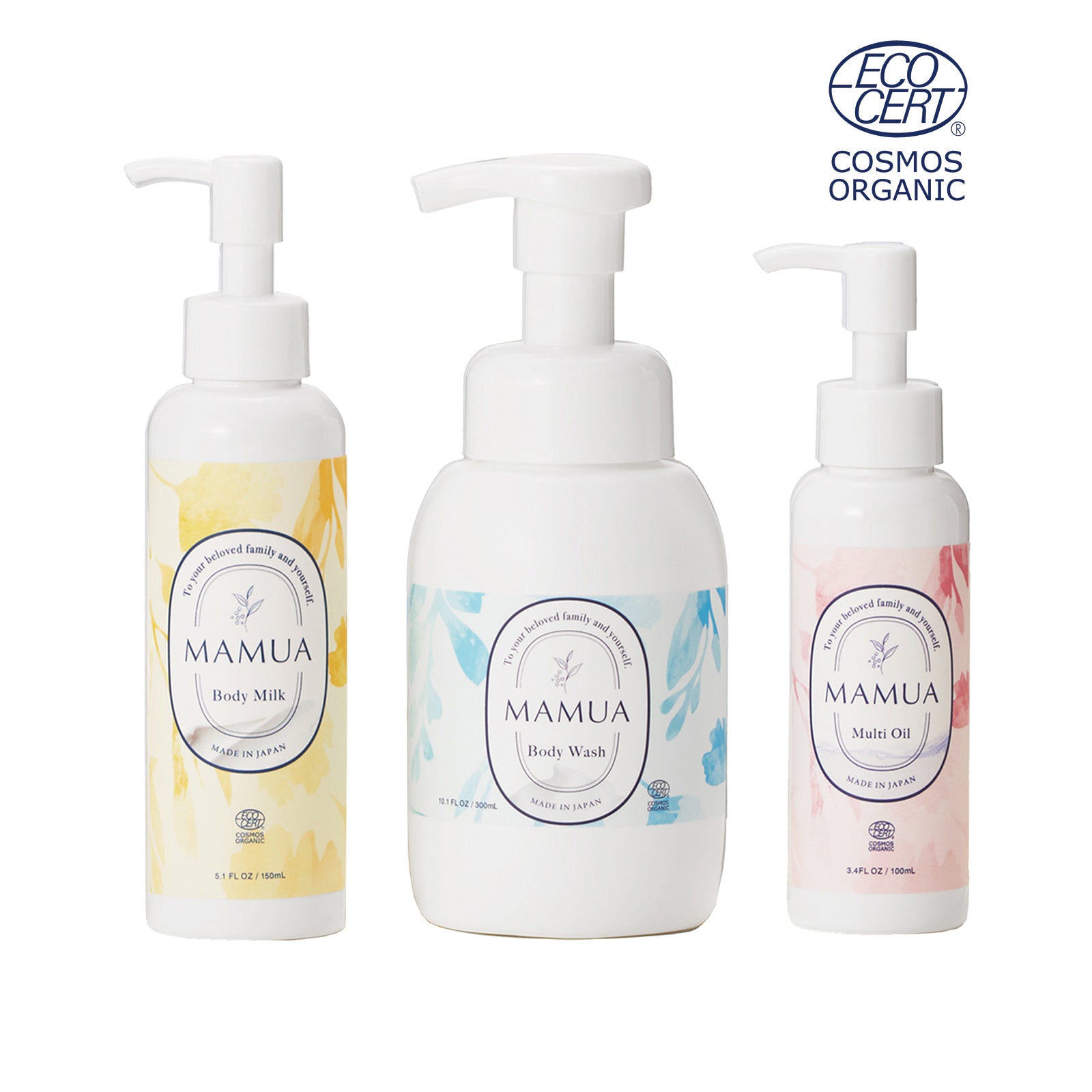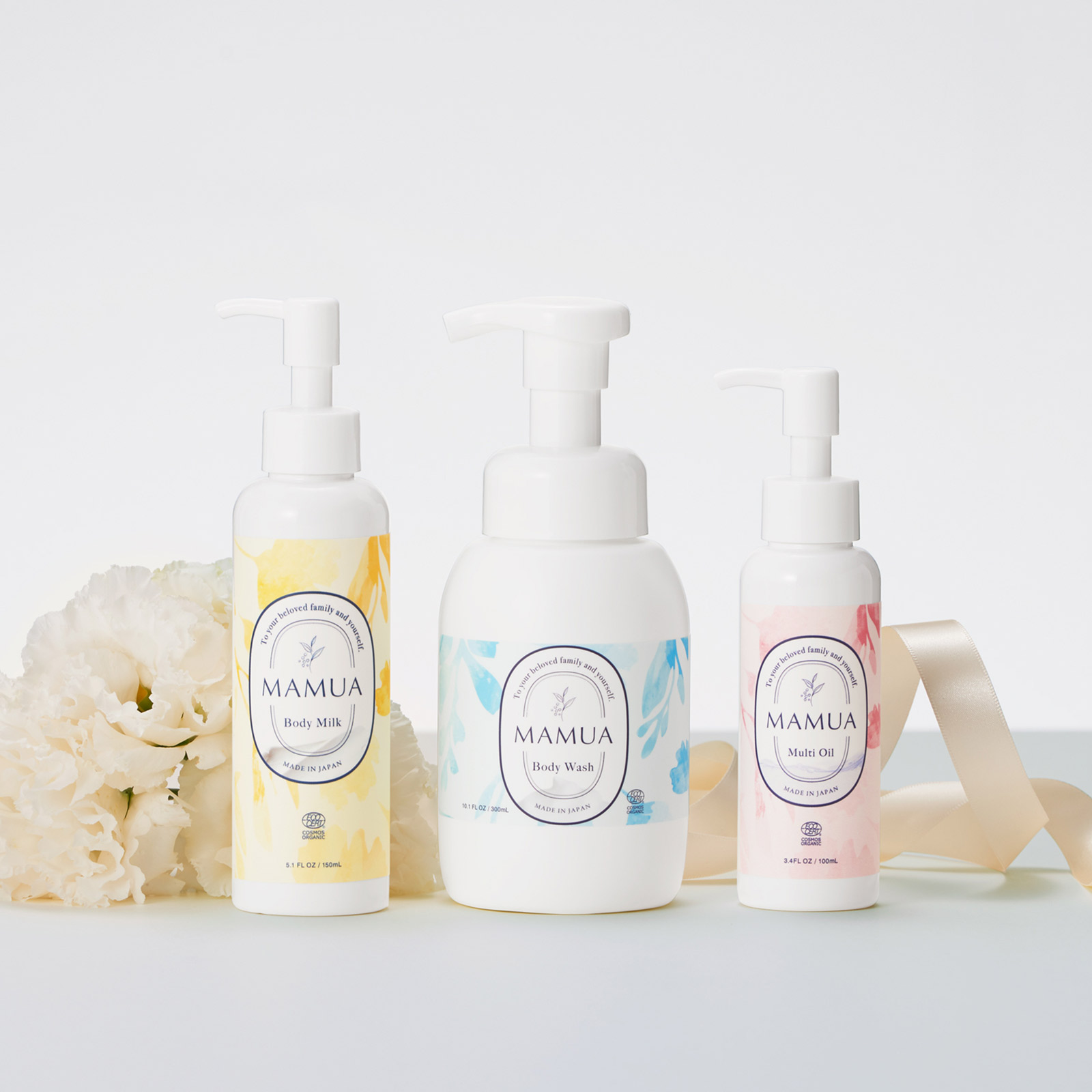 大口注文・法人のお問い合わせはこちら出産祝い・出産準備ギフトにぴったりなオーガニック ボディケア3本セットです。 初めてママになった方への「母の日」ギフトとしてもおすすめ。 MAMUA (マムア)は、「変化する自分の肌」と「家族の肌」を同時にケア。 ママケア、ベビーケアがMAMUA (マムア)の製品1本でできます。 泡ボディウォッシュとマルチオイルはフェムケアにもお使いいただけます。