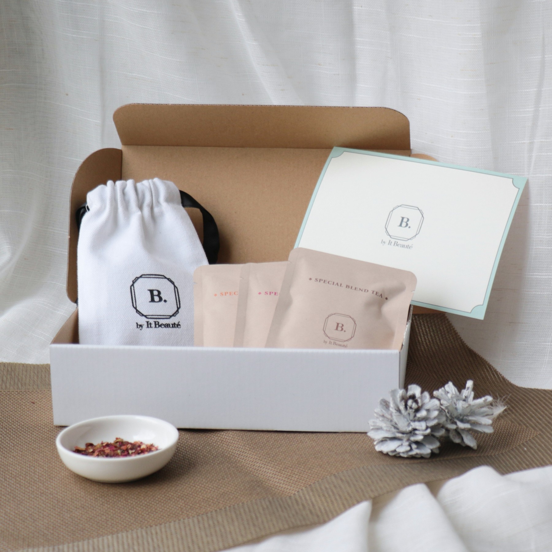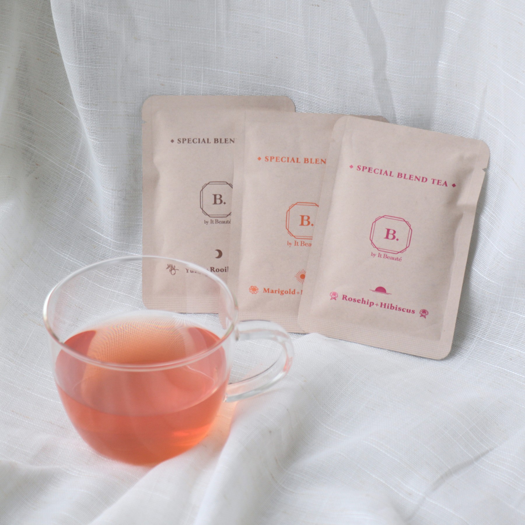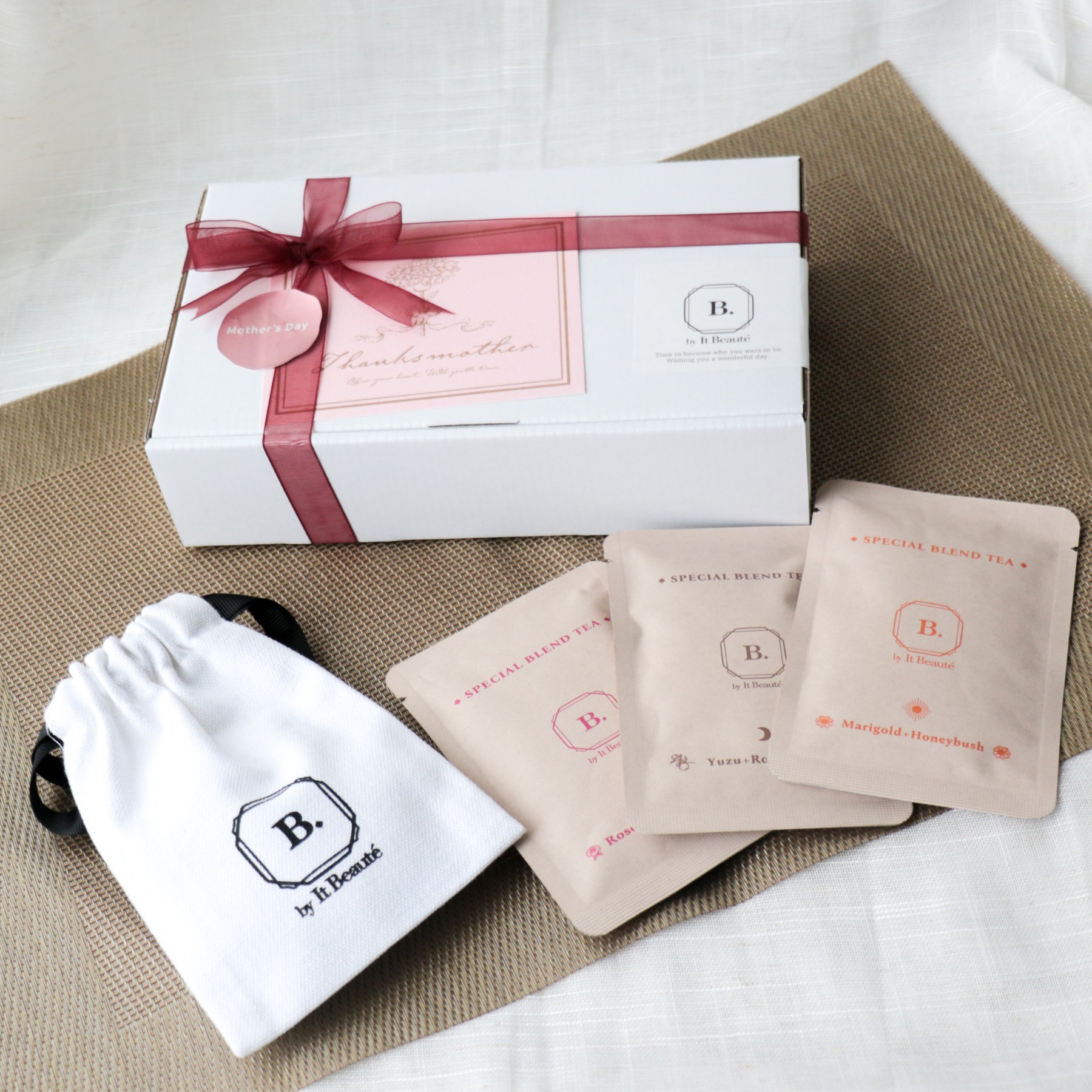 大口注文・法人のお問い合わせはこちらB.by It Beautéから、ギフトシーズンに合わせたスペシャルギフトをお届け。 ローズヒップ・ハイビスカスティー、マリーゴールド・ハニーブッシュティー、ゆず・ルイボスティーの3種にそれぞれのフレーバーに合わせて、コラーゲンペプチド、乳酸菌、GABAを加えたカラダ想いのハーブティー3種のギフトセット。 香料不使用・ノンカフェイン・国内製造とこだわりの詰まったハーブティーです。