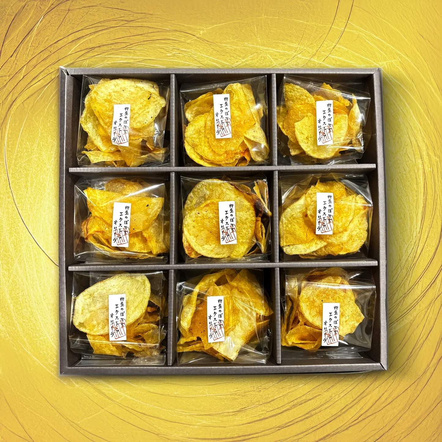 当店人気No.1の”杵屋のぽてち エクストラオリーブ”のみを贅沢に詰め合わせたスペシャルギフトが登場! エクストラバージンオリーブオイルを100%使用しカリッと揚げたぽてちは、まさに「黄金」。 その輝きと美味しさは、特別な日の贈り物にぴったり。 ご家族やご友人へのご挨拶はもちろん、ビジネスシーンでの贈り物としても、幅広い場面でご利用いただけます。