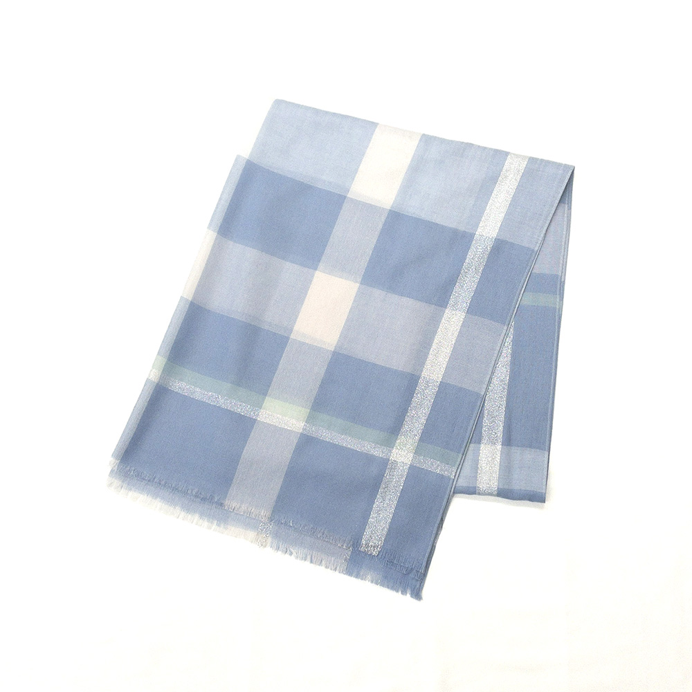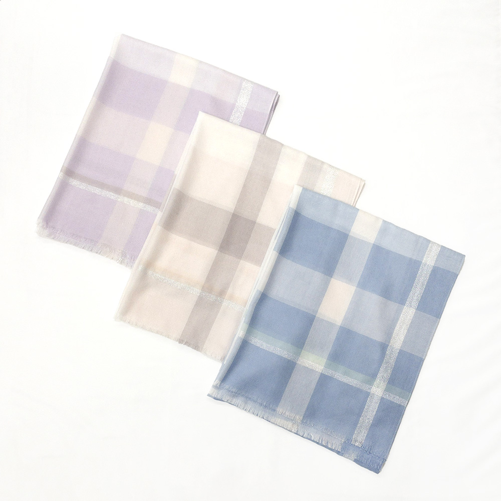 大口注文・法人のお問い合わせはこちらパステルカラーのラメ入りチェック柄ストールです。ハリのある薄手生地なので暑い時期でもさらっと使えてウェアリングのアクセントとしてもUVケアアイテムとしても使えます。