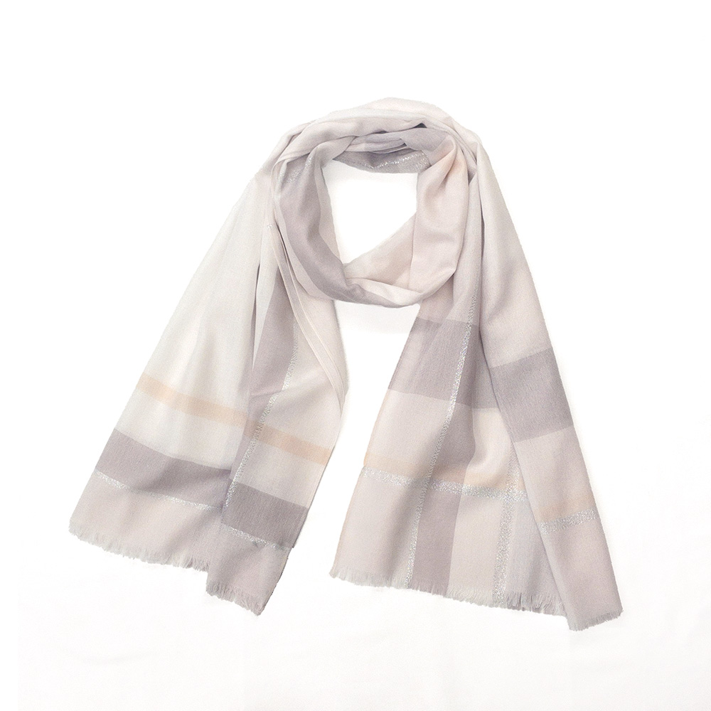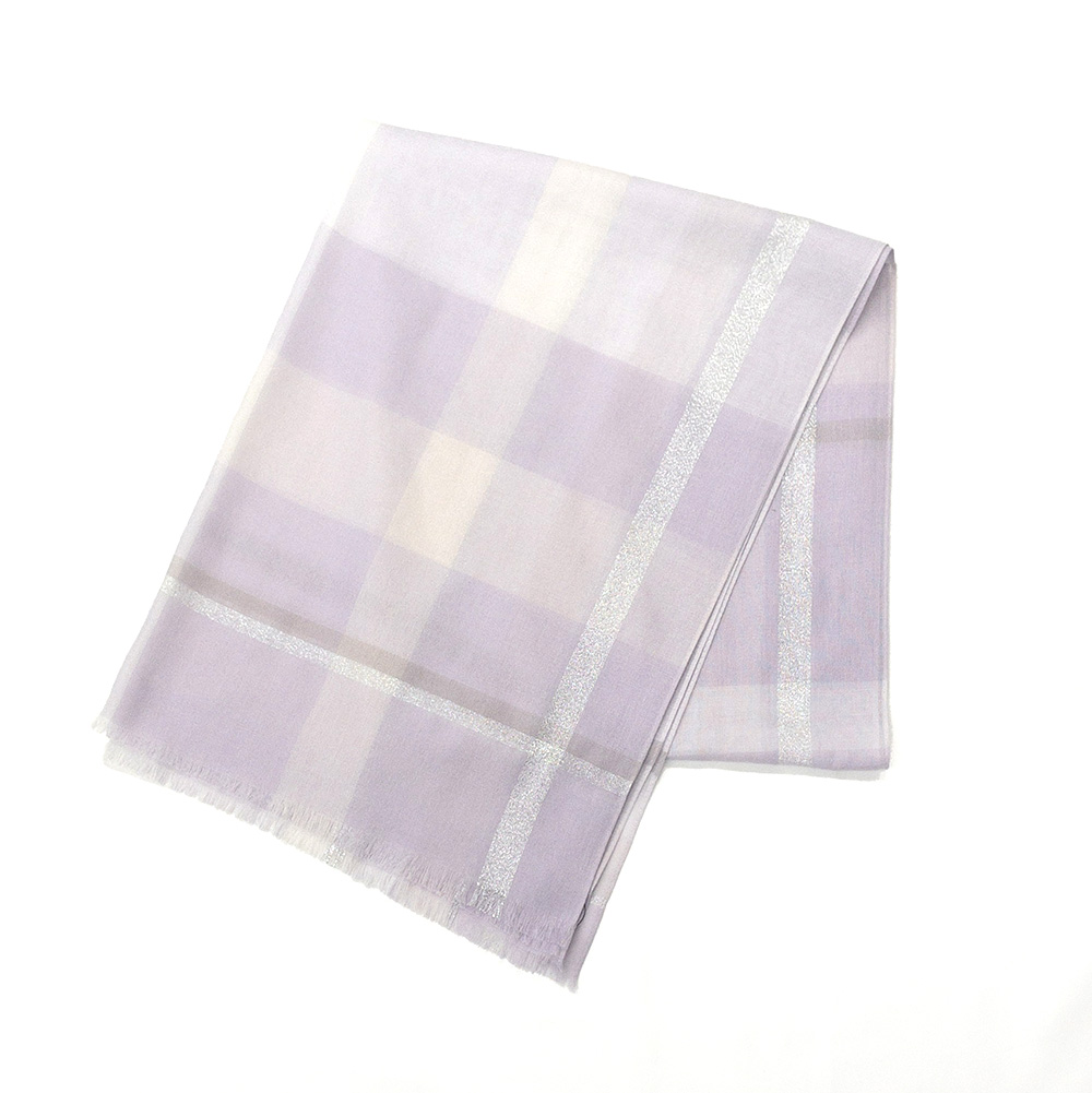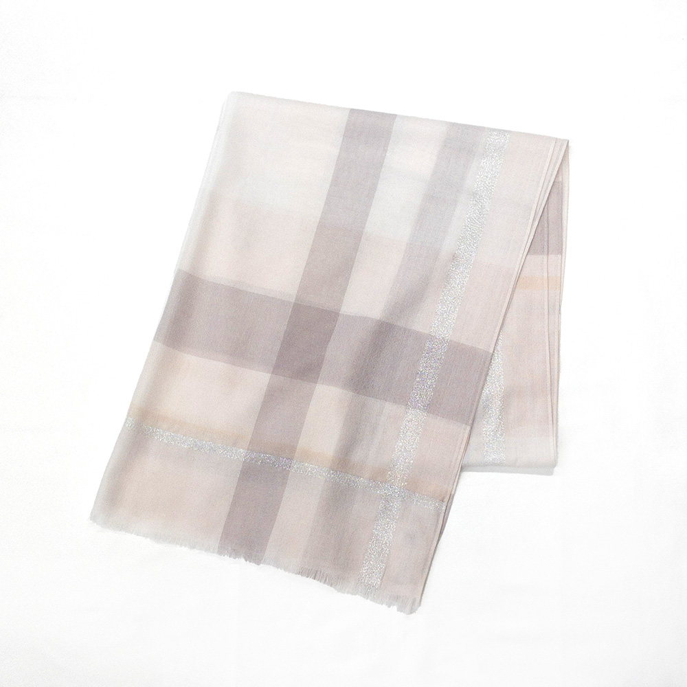 シーズンのトレンドを抑えたマフラーやストールを提供する「CNK(シーエヌケー)」のパステルカラーのラメ入りチェック柄ストール。ハリのある薄手生地なので暑い時期でもさらっと使えてウェアリングのアクセントとしてもUVケアアイテムとしても使えます。肌寒い日にも日差しの強くなるこれからのシーズンのプレゼントに最適です。