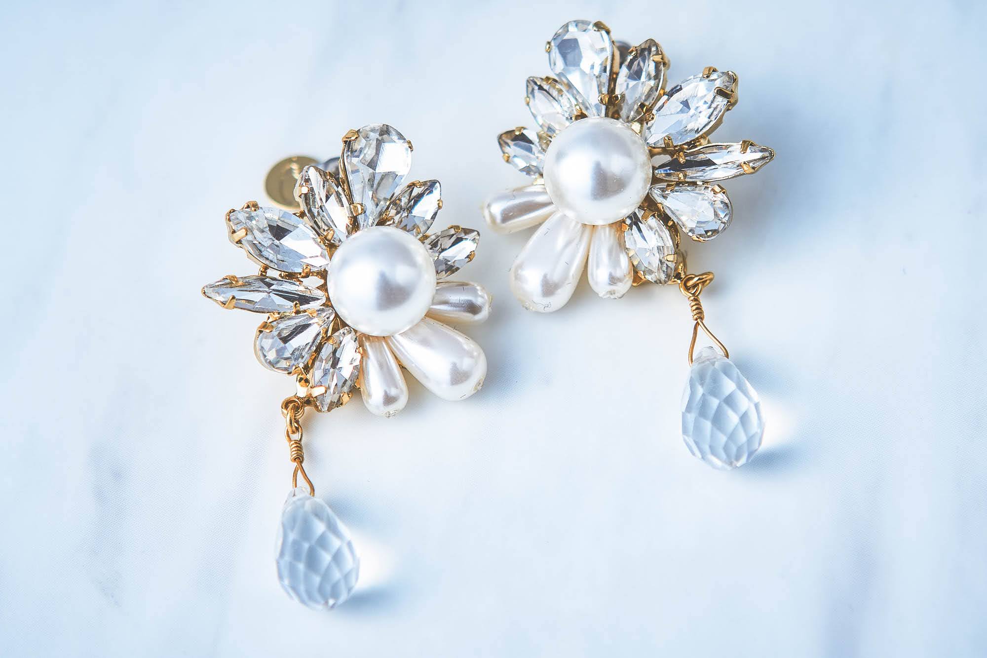 パールビジューの下でティアドロップビーズがゆらゆら揺れる立体的なつくりになっており、エレガントさを感じさせます。 上品さを演出するアクセサリーとしていかがでしょうか?
