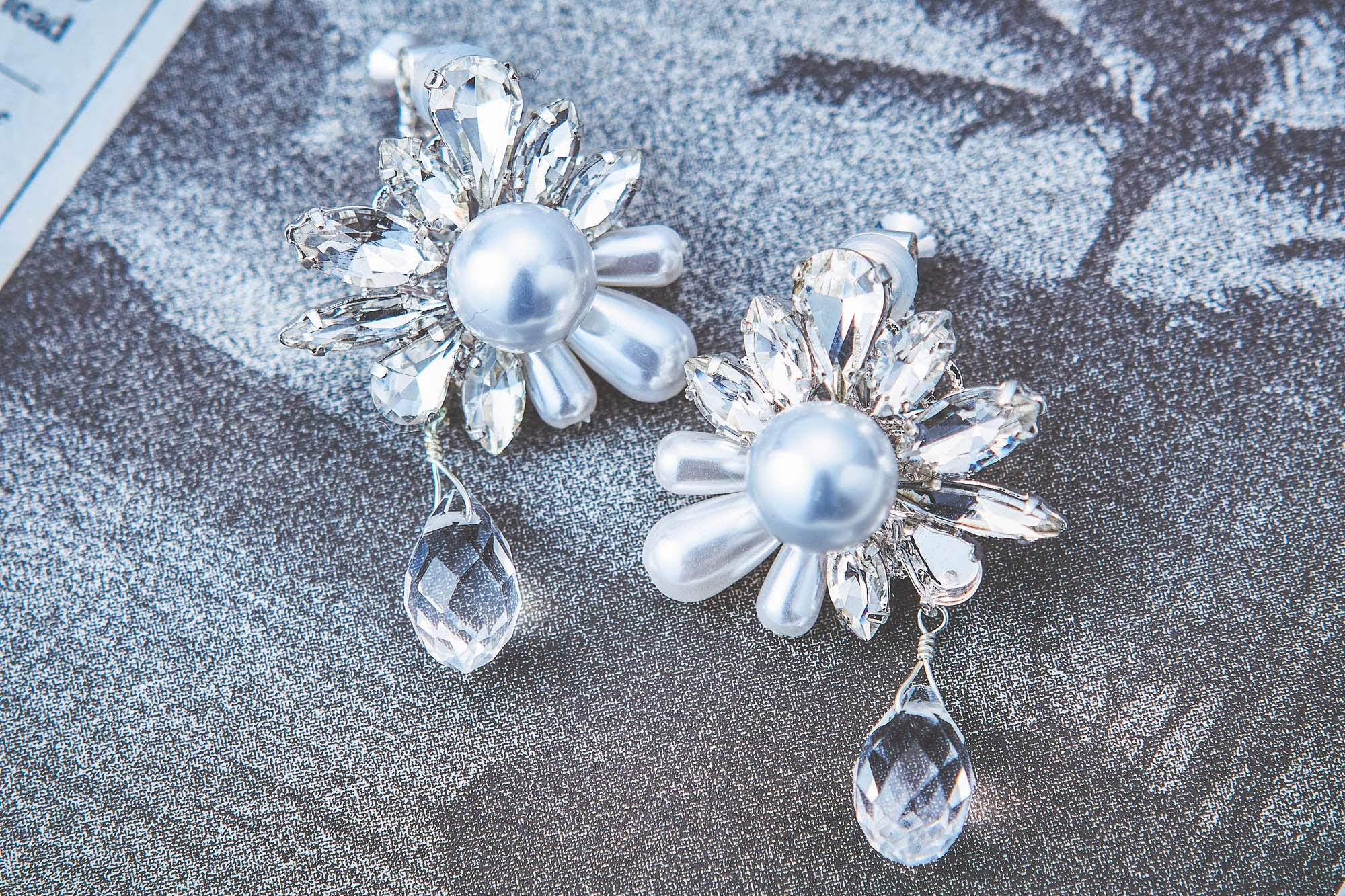 パールビジューの下でティアドロップビーズがゆらゆら揺れる立体感あるエレガントなデザイン。ティアドロップビーズは取り外すことができます。