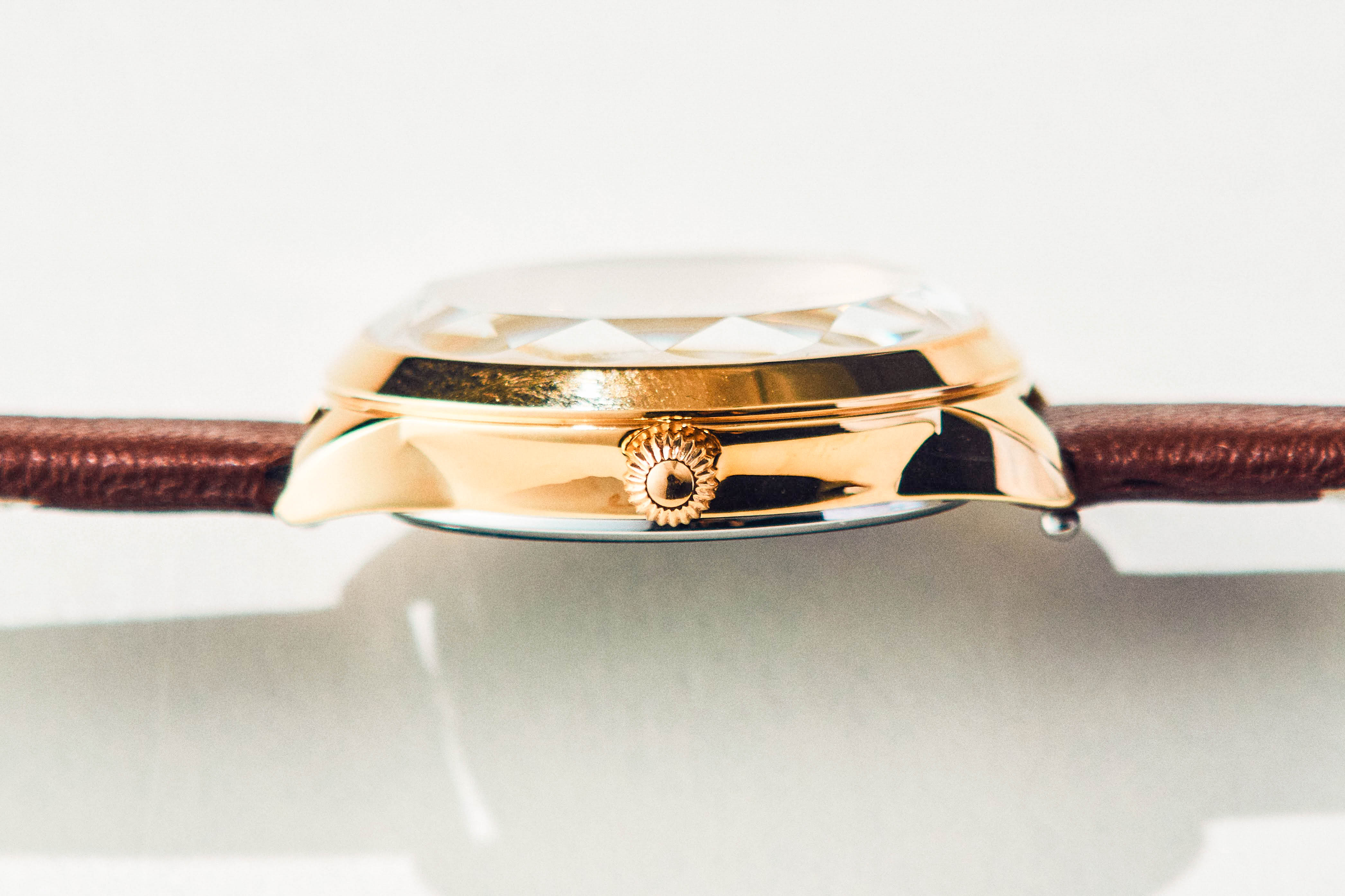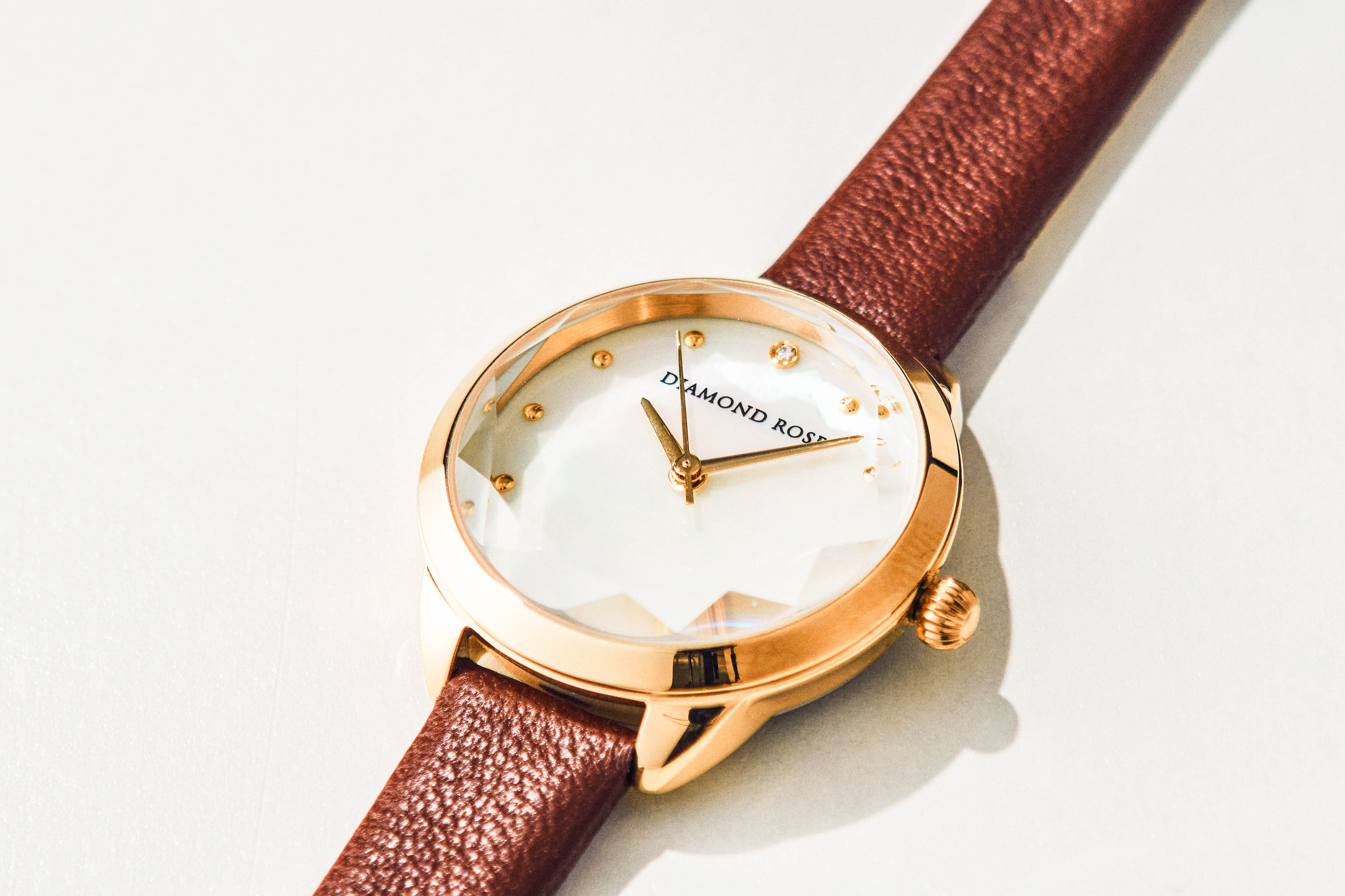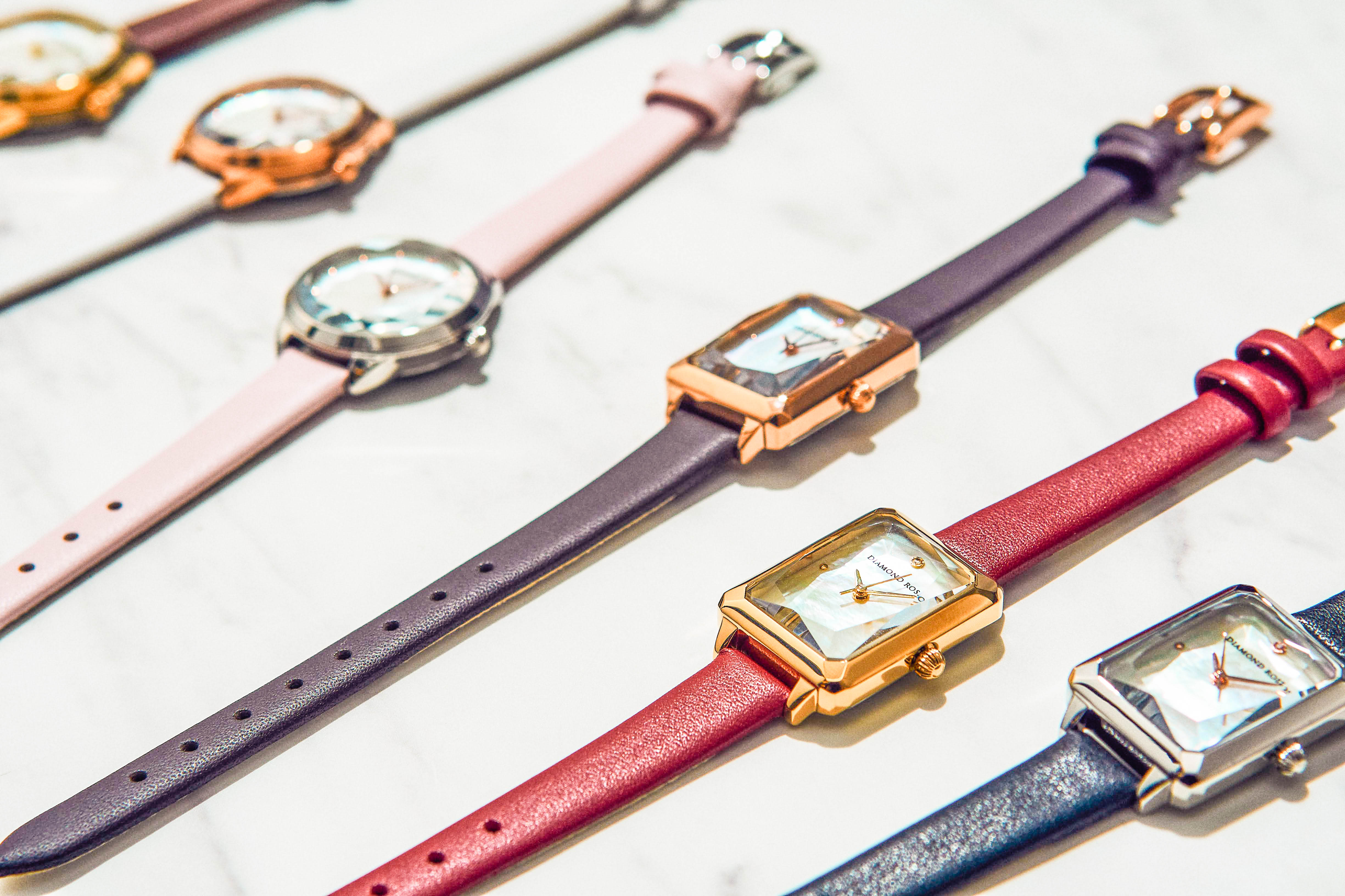 時計のガラスは、クリスタルガラスカットです。 一つ一つ丁寧に作られ、まるで宝石のようにデザインされています。 カジュアルからビジネスシーンまで幅広いファッションに合わせられる デザインのため、大人の女性の方にぴったりです。