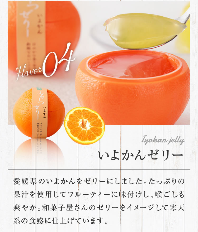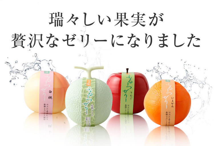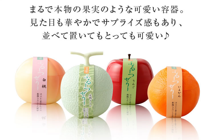 | 原材料 | ・完熟メロンゼリー メロンピューレ(茨城県産)、砂糖、トレハロース、脱脂粉乳、ゲル化剤(増粘多糖類)、 クエン酸、香料、酸化防止剤、クエン酸ナトリウム、消泡剤、着色料(紅花黄、クチナシ青色素) (一部に乳成分含む) ・白桃ゼリー 白桃(国産)、ピーチエキス、砂糖、トレハロース、ホワイトキュラソー、還元水飴、 ゲル化剤(増粘多糖類)、酸味料、香料、消泡剤 ・りんごゼリー りんご(信州産・青森産)、りんご果汁、砂糖、トレハロース、還元水飴、 ゲル化剤(増粘多糖類)、酸化防止剤(V.C)、酸味料、香料 ・いよかんゼリー 伊予柑ペースト(愛媛県産)、砂糖、伊予柑皮、トレハロース、エタノール、 ゲル化剤(増粘多糖類)、クエン酸、還元水飴、水飴、酸化防止剤(V.C)、増粘剤(ペクチン) |