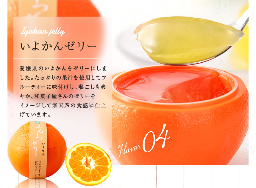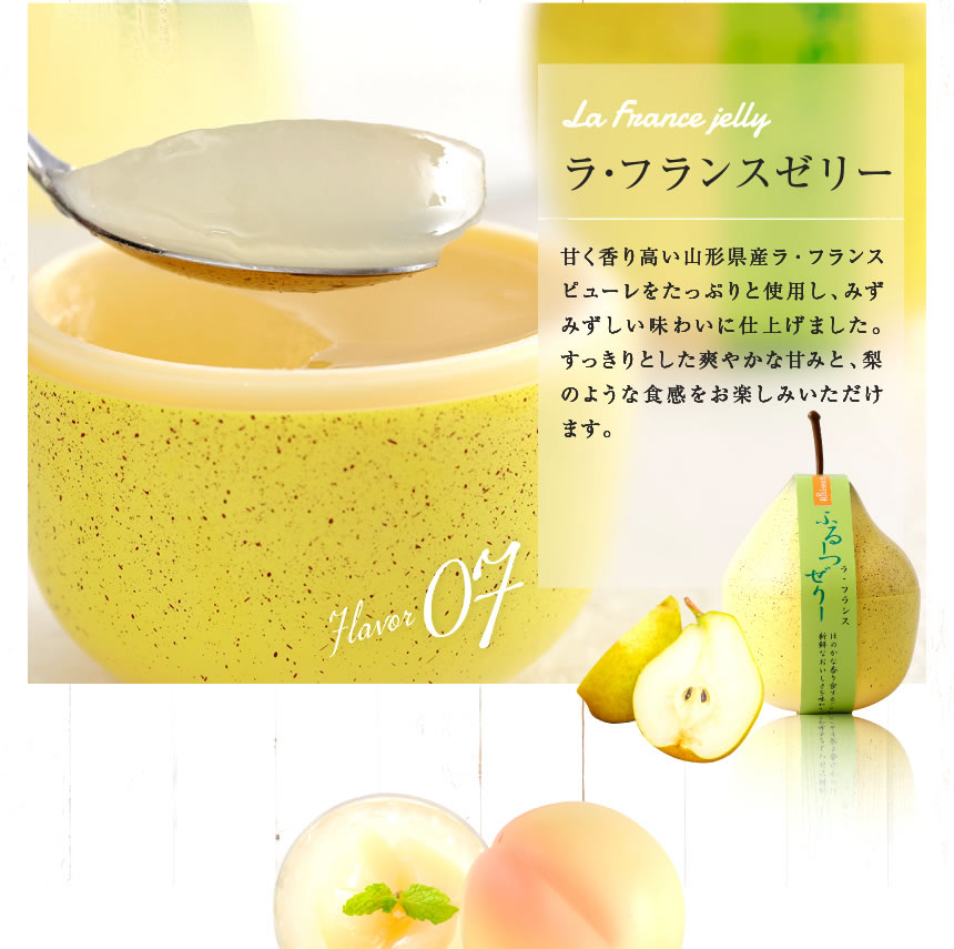 | 原材料 | ・完熟メロンゼリー メロンピューレ(茨城県産)、砂糖、トレハロース、脱脂粉乳、ゲル化剤(増粘多糖類)、 クエン酸、香料、酸化防止剤、クエン酸ナトリウム、消泡剤、着色料(紅花黄、クチナシ青色素)(一部に乳成分含む) ・白桃ゼリー 白桃(国産)、ピーチエキス、砂糖、トレハロース、ホワイトキュラソー、還元水飴、 ゲル化剤(増粘多糖類)、酸味料、香料、消泡剤 ・りんごゼリー りんご(信州産・青森産)、りんご果汁、砂糖、トレハロース、還元水飴、 ゲル化剤(増粘多糖類)、酸化防止剤(V.C)、酸味料、香料 ・いよかんゼリー 伊予柑ペースト(愛媛県産)、砂糖、伊予柑皮、トレハロース、エタノール、 ゲル化剤(増粘多糖類)、クエン酸、還元水飴、水飴、酸化防止剤(V.C)、増粘剤(ペクチン) ・和梨ゼリー 梨ピューレ(千葉県産)、砂糖、トレハロース、ゲル化剤(増粘多糖類)、クエン酸、 クエン酸ナトリウム、酸味料、香料、酸化防止剤 ・北海道メロンゼリー メロンピューレ(北海道産)、砂糖、脱脂粉乳/トレハロース、ゲル化剤(増粘多糖類)、 クエン酸、香料、酸化防止剤、クエン酸ナトリウム、消泡剤、 着色料(紅花黄、クチナシ青色素)(一部に乳成分含む) ・ラ・フランスゼリー ラ・フランスピューレ(山形県産)、砂糖/トレハロース、ゲル化剤(増粘多糖類)、クエン酸、 クエン酸ナトリウム、酸味料、香料、酸化防止剤(V.C) |