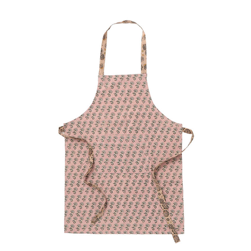 コットン100%のスラブ生地で作られたエプロンです。ブロックプリント調のスクリーンプリントを凹凸のあるラフな素材感のスラブ生地にプリント。柄を組み合わせアクセントのあるデザインが魅力です。
