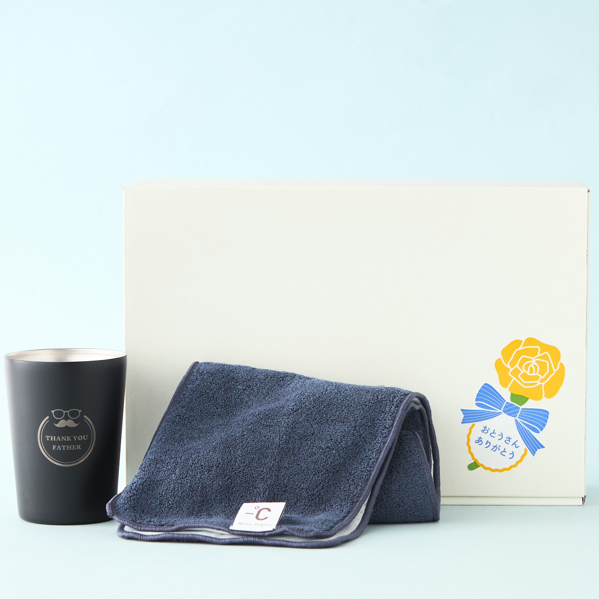 お父さんに向けた感謝のメッセージとイラストを刻印したステンレス製サーモタンブラーと、暑い季節やスポーツの際にぴったりな冷たく感じるタオルセットです。タオルには名入れが可能で、特別感を演出します。父の日ボックスに入れてお届けします。