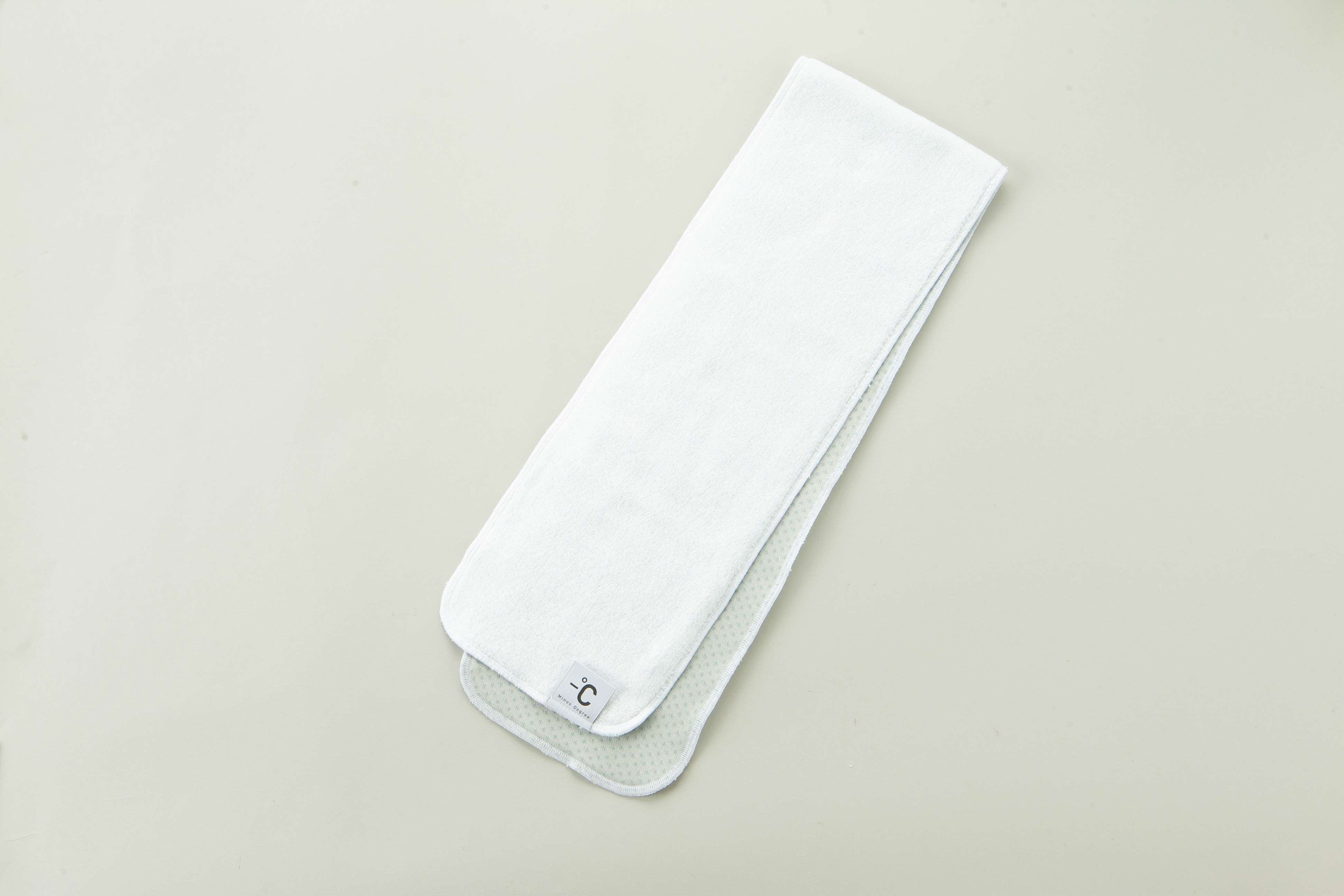 裏地にはネムール社の接触冷感素材『ゼロクール』を使用しています。 乾いている時はもちろん濡らすことで、さらに接触冷感機能がより効果を発揮してくれます。 裏地が温かくなってきても、タオルをパタパタと風に当てるだけで冷たさがまた戻ります。
