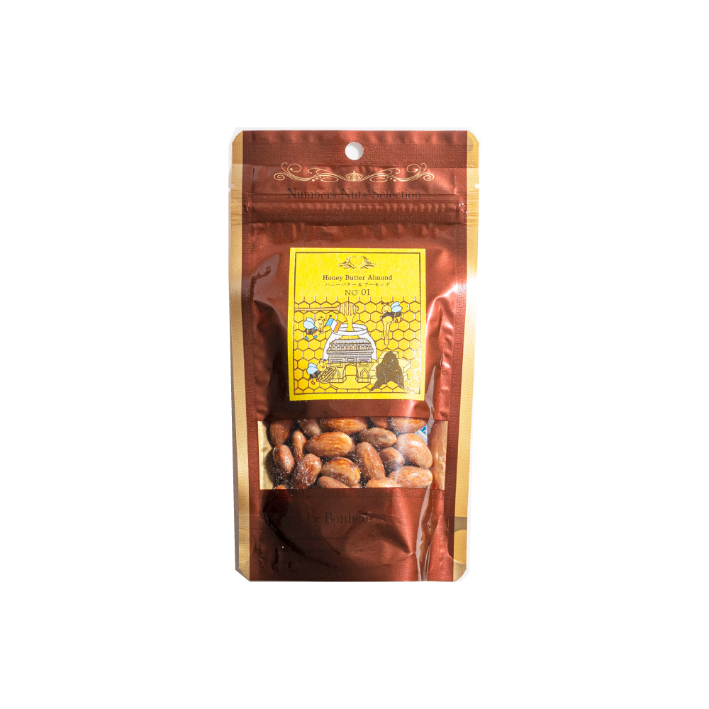 ハチミツとフランス産醗酵バター&ロレーヌ岩塩のマイルドな甘さとナッツの香ばしいアーモンドの味わいが特徴の「ハニーバター&アーモンド」。 普段からナッツを好んで食べる方にもおすすめの一品。 素焼きのナッツとは異なる風味豊かでまろやかな甘さがクセになる上質な味わいがお楽しみいただけます。珈琲や紅茶にもよく合います。