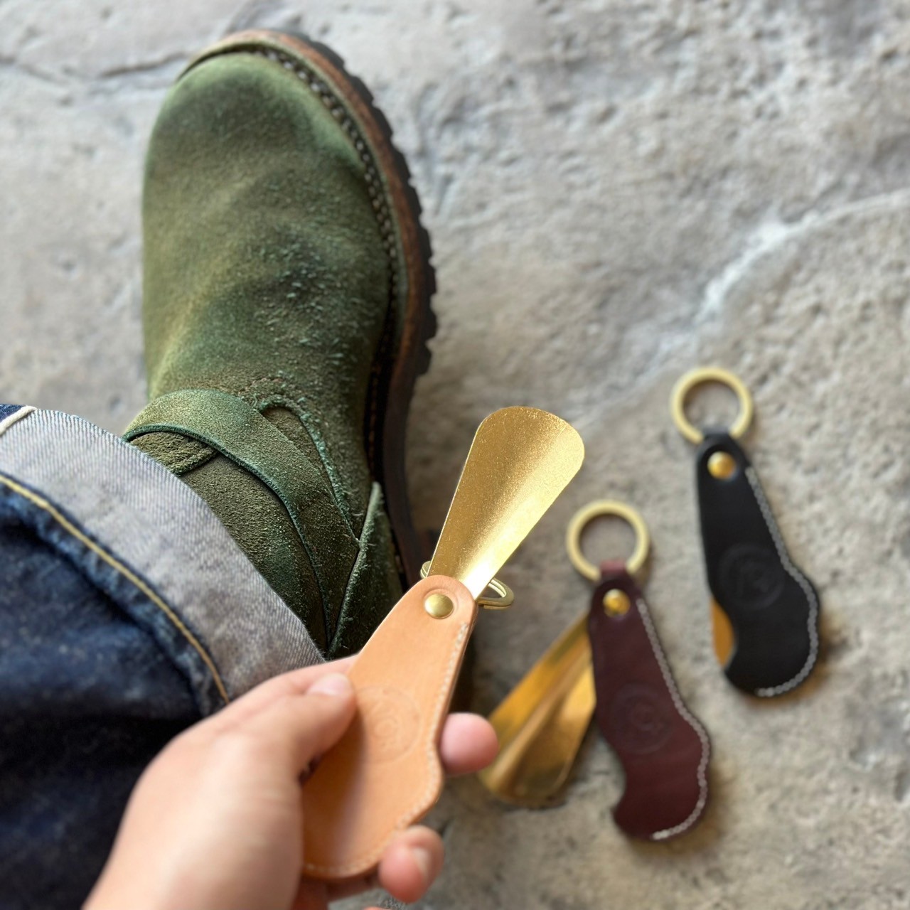 大口注文・法人のお問い合わせはこちら靴ベラは真鍮(ブラス)で出来ており、使い込むとレザー同様に味が出てきます。 バタフライ式で靴ベラをスライドして容易に出し入れが出来る仕組みとなっています。