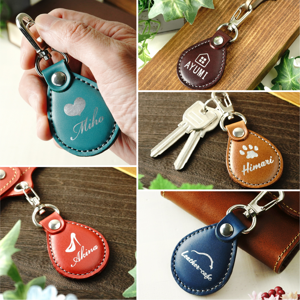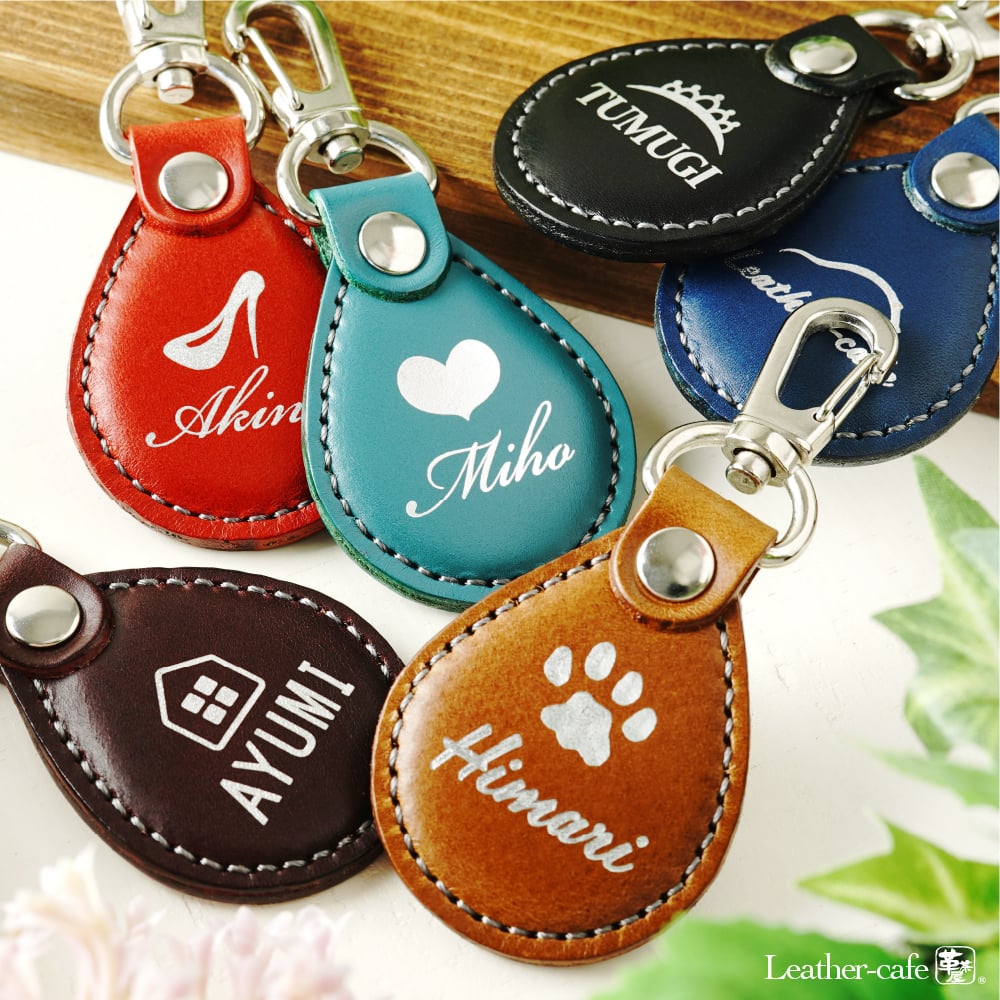 イタリア産革の鮮やかな発色とカラーバリエーション豊富な、選べるイラストの名入れドロップ型キーホルダー。