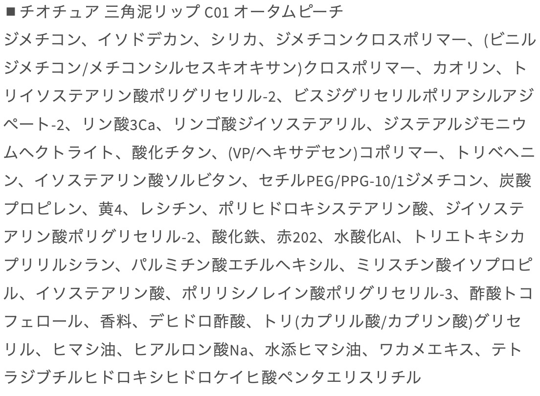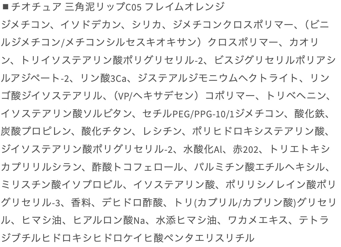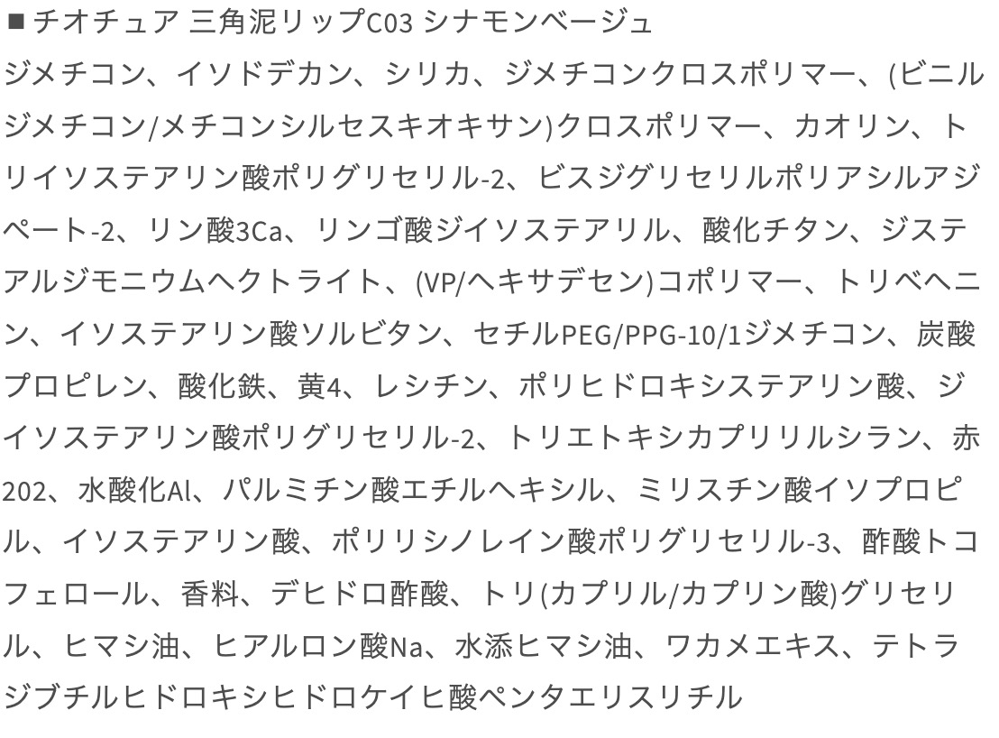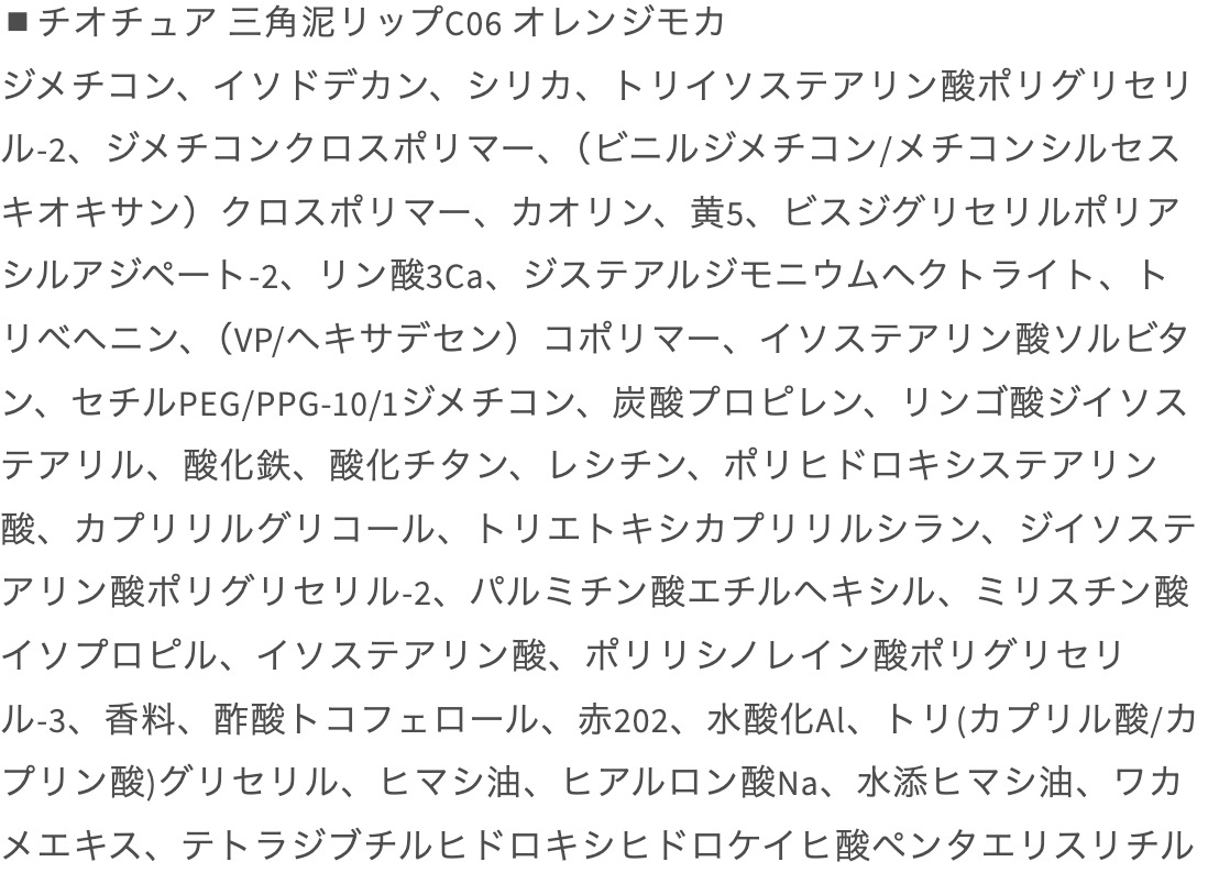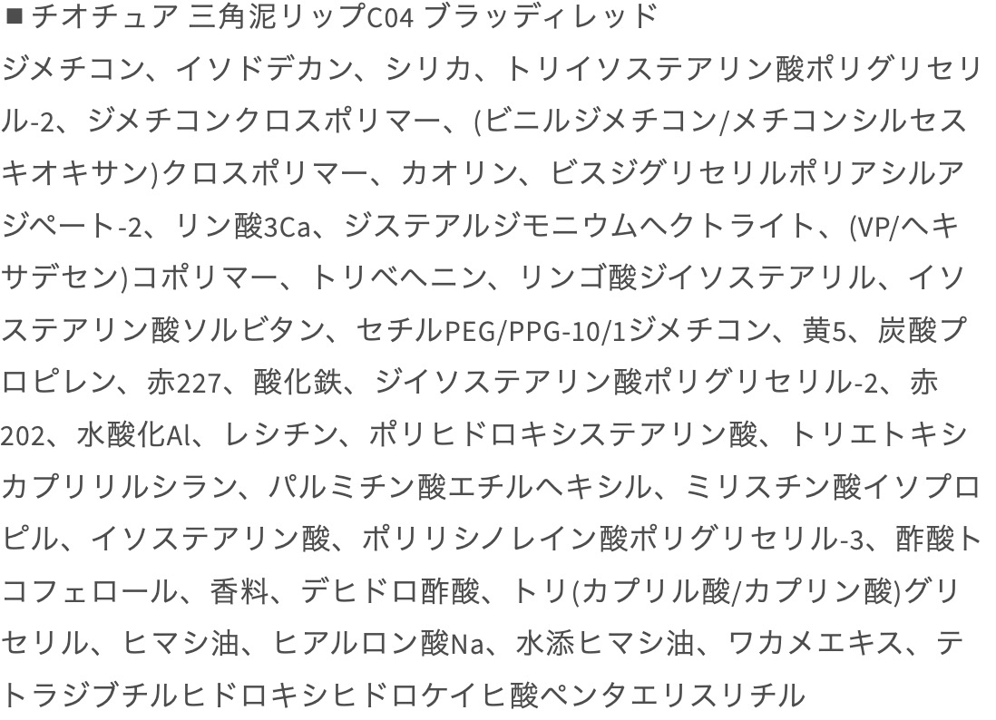 | ご使用上/安全上の注意 | ・本来の用途以外の目的でお使いにならないでください。 ・唇に異常があらわれたときは、ご使用はおやめください。 ・化粧品がお肌に合わないとき即ち次のような場合には、使用を中止してください。 (1)使用中、赤み、はれ、かゆみ、刺激、色抜け(白斑等)や黒ずみ等の異常があらわれた場合 (2)使用したお肌に、直射日光があたって上記のような異常があらわれた場合そのまま化粧品類の使用を続けますと、症状を悪化させることがありますので、皮膚科専門医にご相談されることをおすすめします。 |