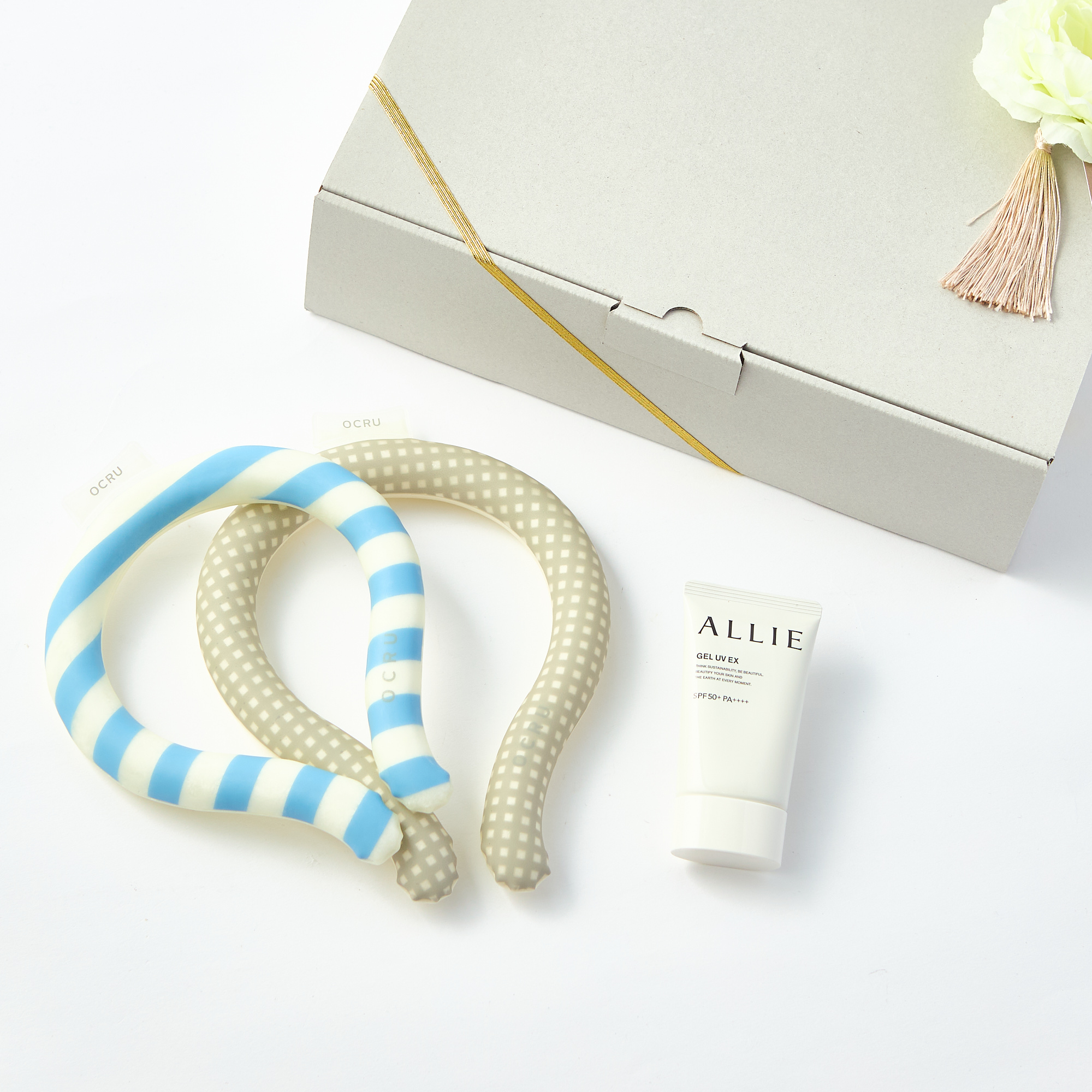 水相成分約65%の密着ジェルで、長時間うるおってベタつかずキレイな仕上がりがつづく日焼け止めと凍らせて何度でも使える、地球にやさしい新しい夏のクールグッズのセットです。ギフトBOXの種類は、お好みに合わせてご選択いただけます。