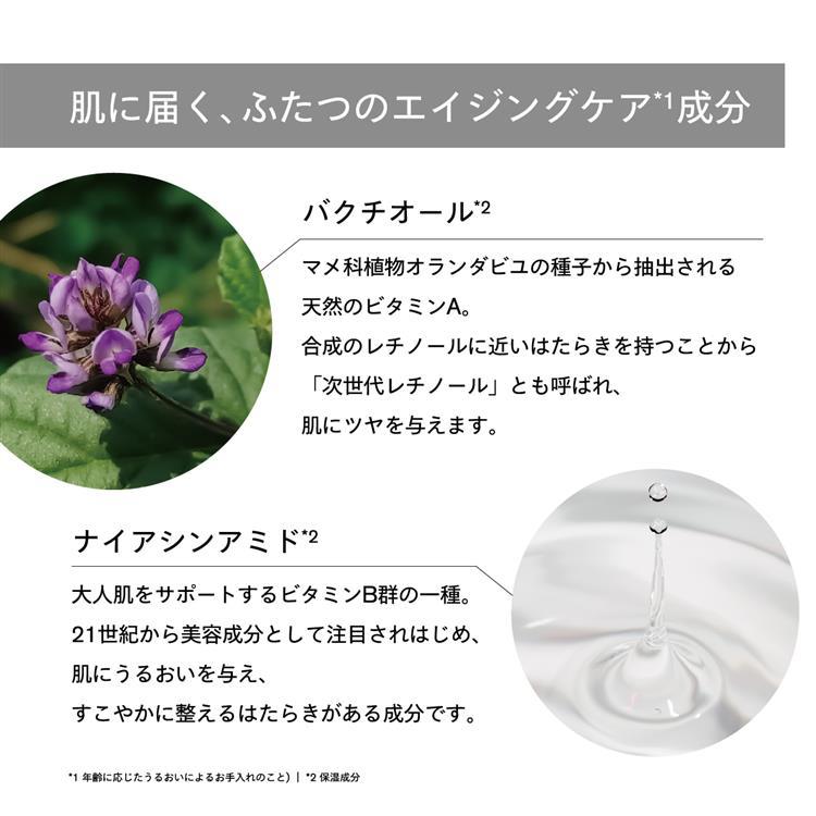 次世代レチノールと呼ばれ、肌にツヤを与える「バクチオール*1」と、大人肌をサポートするビタミンB群の一種で肌にうるおいを与える「ナイアシンアミド*1」を配合。 ダメージの影響を受けやすい大人肌にハリを与え、つややかでなめらかな美しさへと導きます。