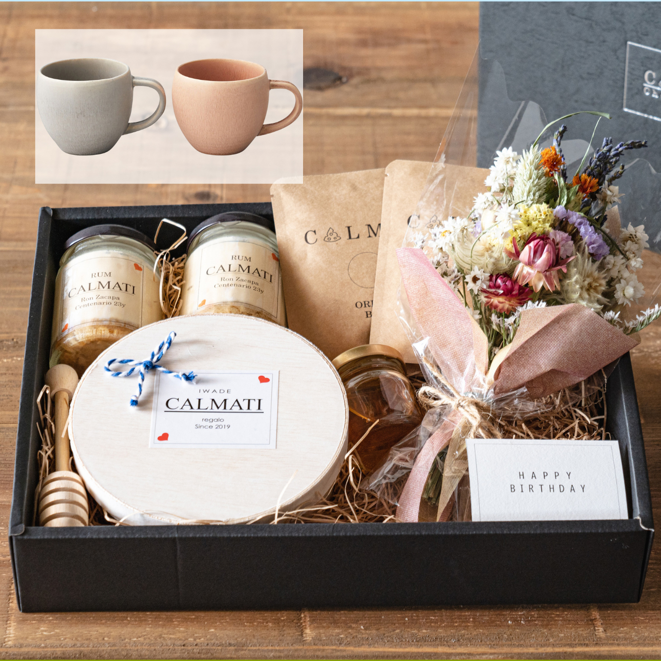 ・ペアカップ(陶器製)×1セット ・ハチミツをかけて完成する濃蜜チーズケーキ ×1 ・オトナのティラミス(ラム)×2 ・ドリップコーヒー ×2 ・ドライフラワーブーケ ×1 ・ハニーディッパー×1