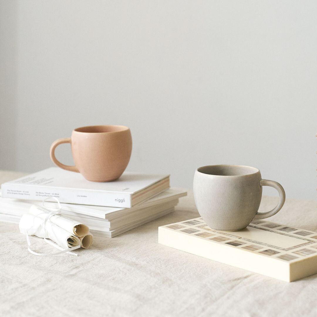 コロンとした形がかわいいマグカップ。 こだわりのスイーツと共に癒しの時間をお愉しみください。