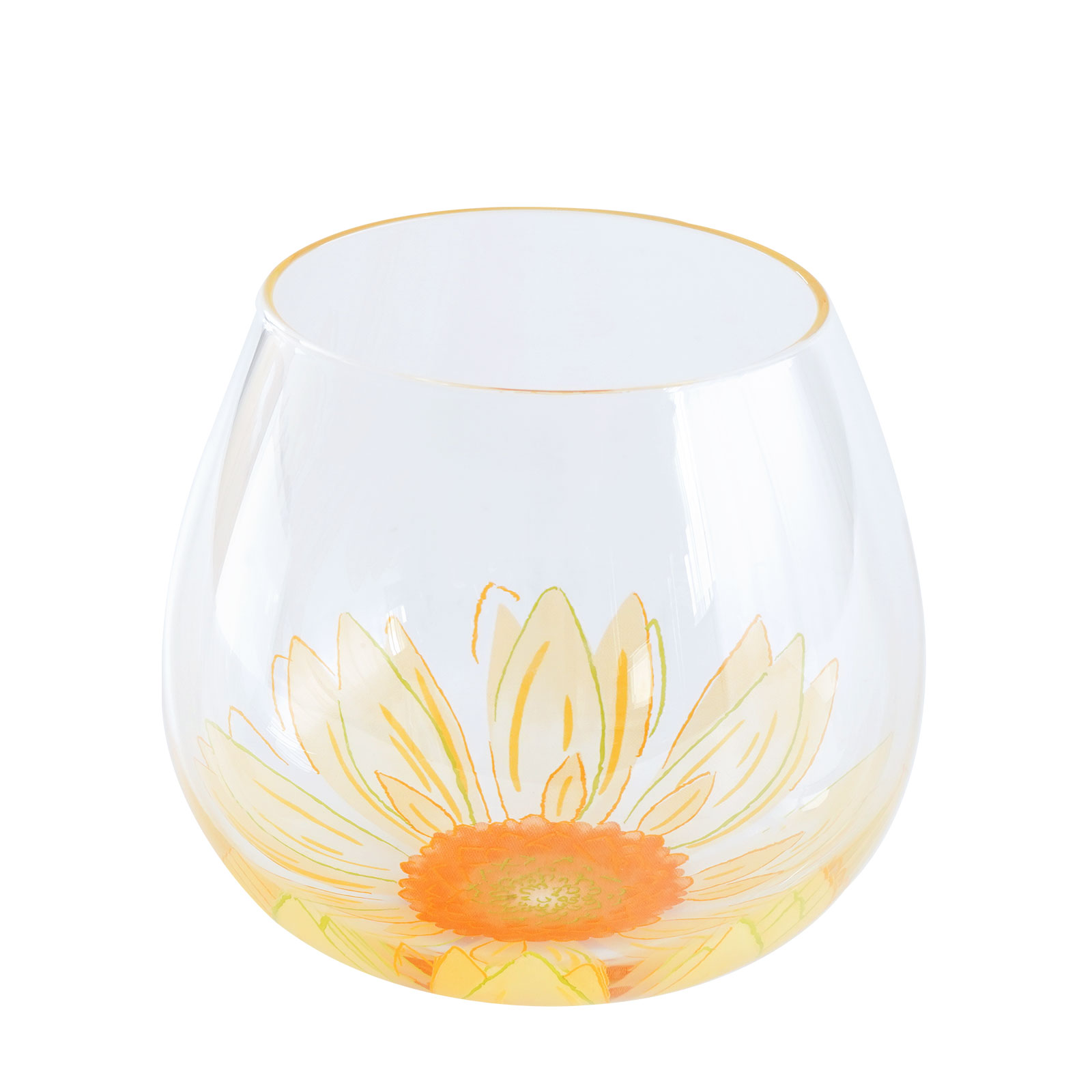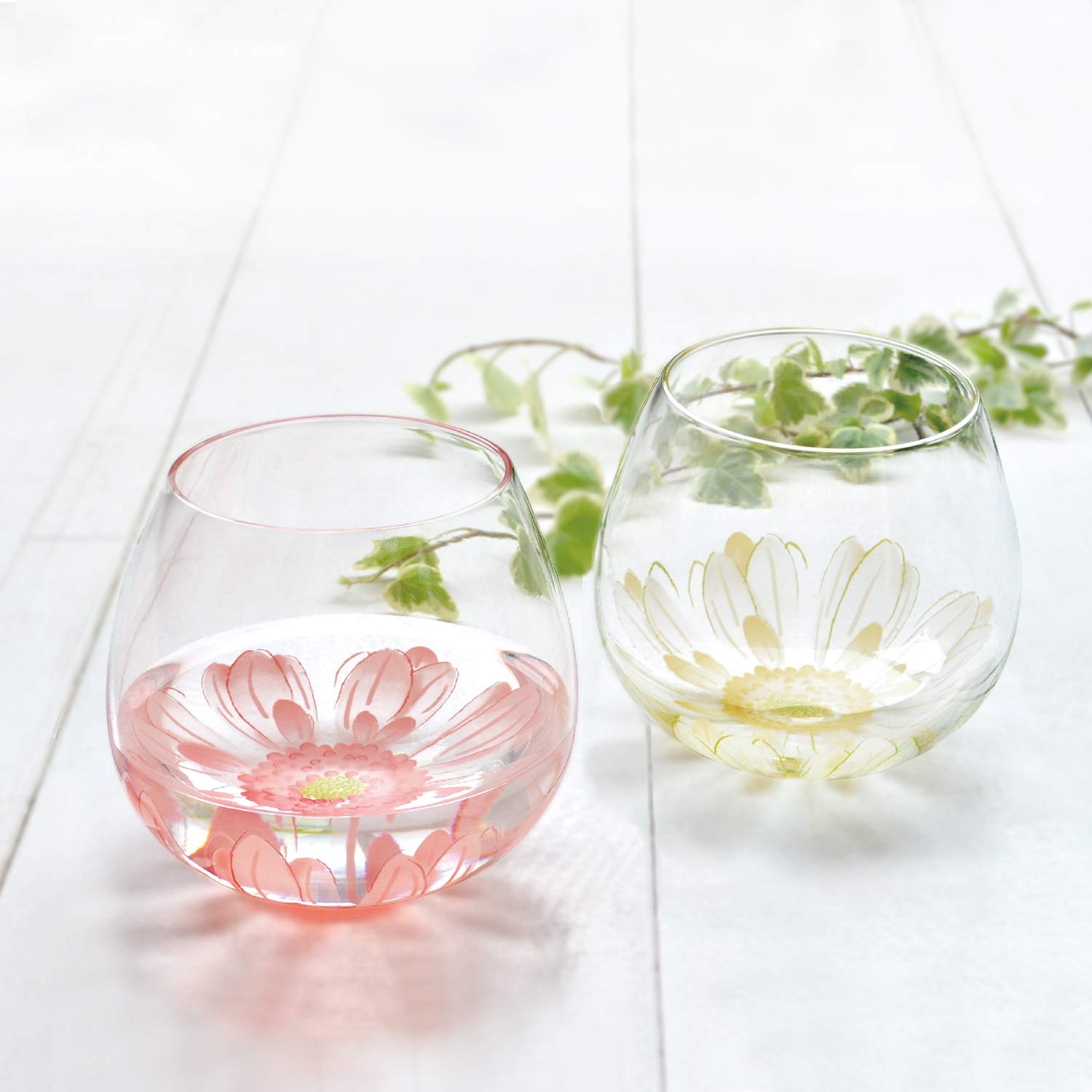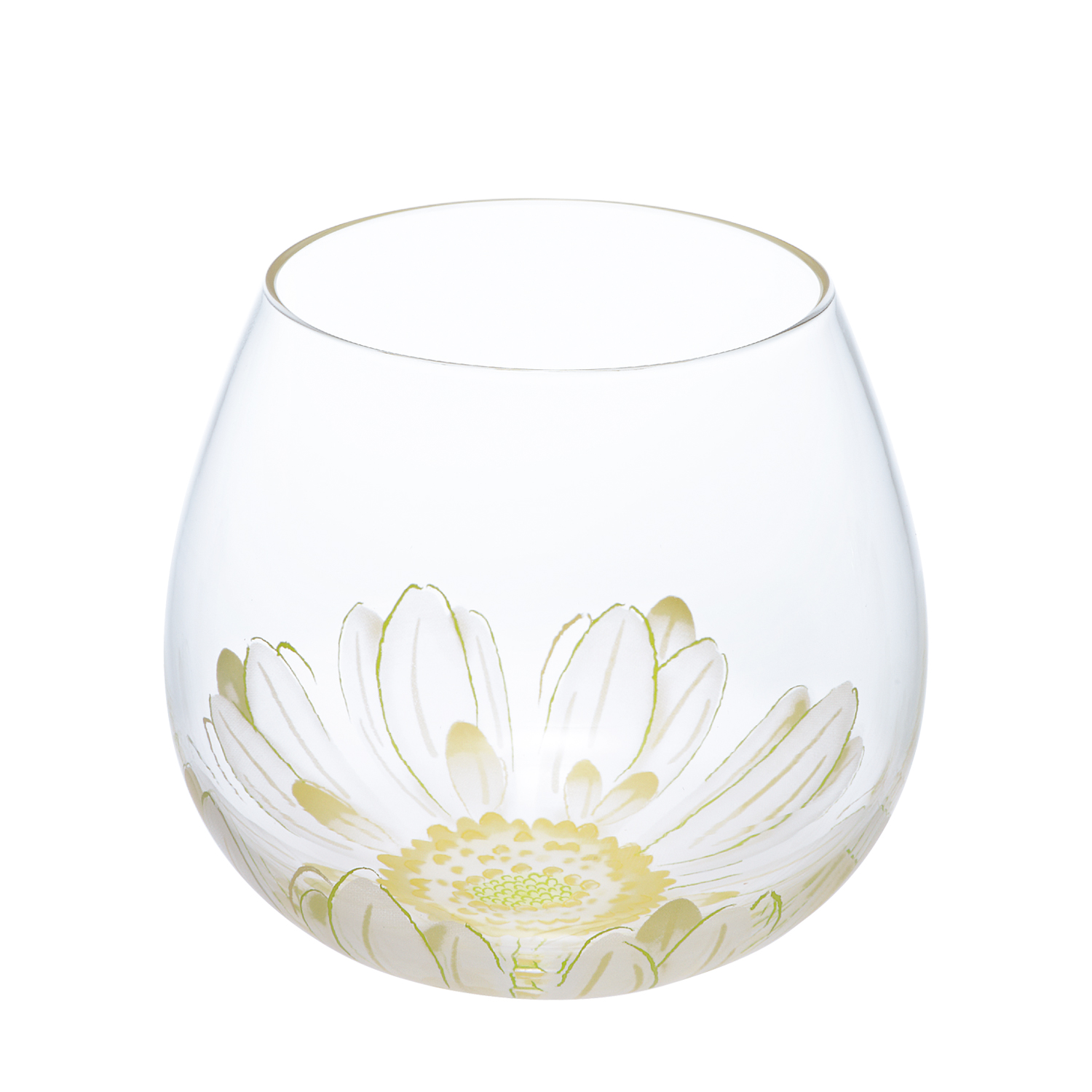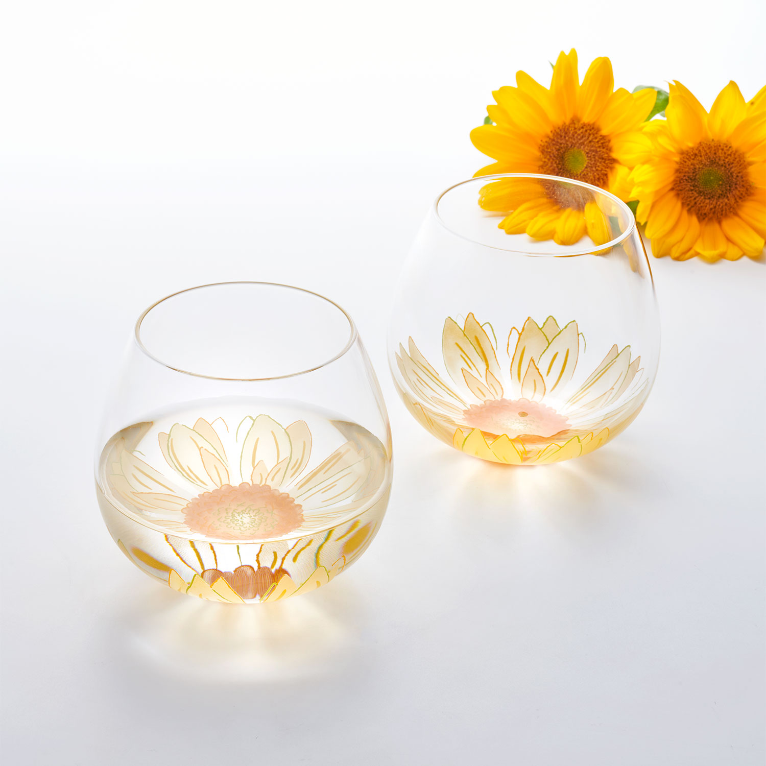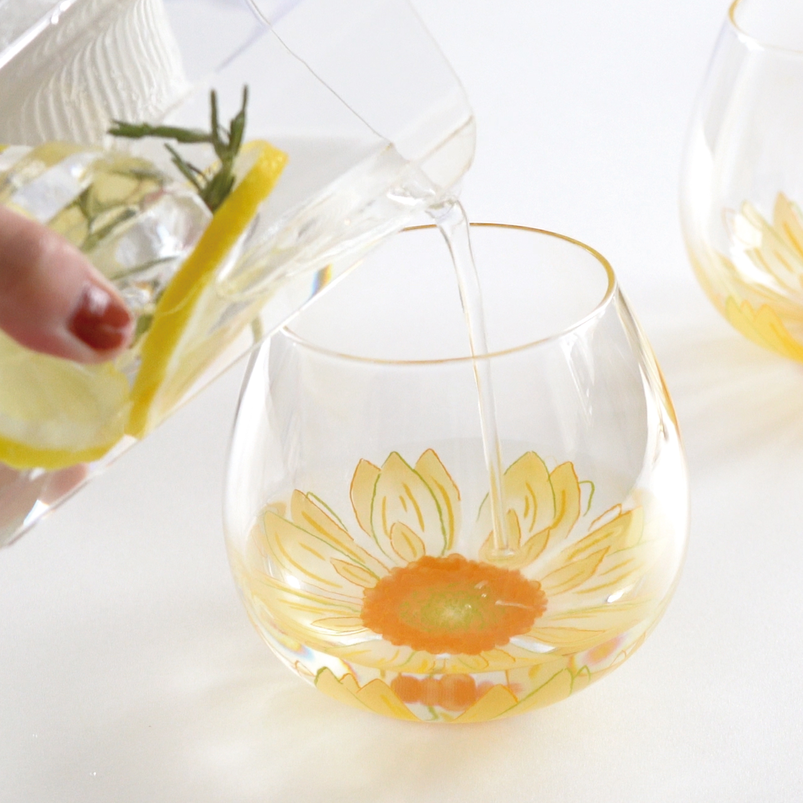 ゆらゆらと揺れる可愛らしい形状のグラスです。3種類のデザインからお選びいただけます。透明な飲み物を入れると「ひまわり柄」は水面に花びらが大きく広がるように、ガーベラの花を施した「ホワイト」と「ピンク」は水面にふわっと花びらが浮かぶように見えます。