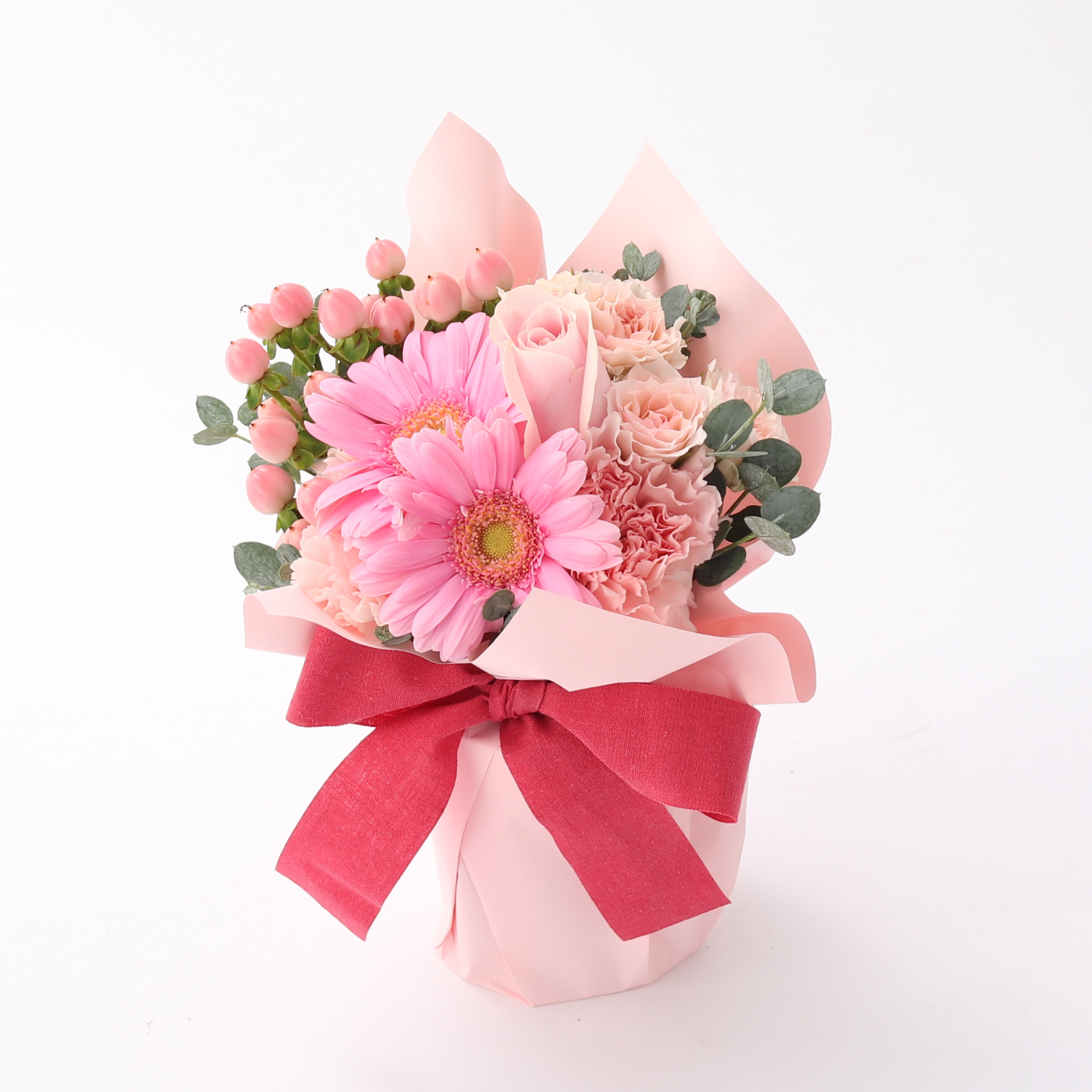 お好みのカラーがお選びいただける生花のスタンディングブーケ。花瓶は不要で、受け取ったらそのままお部屋に飾ることのできるアレンジメント花束です。土台の部分に栄養分や抗菌剤入りのエコゼリーを使用し、水やりや水換えなどのお世話をしなくても大丈夫なので、受け取る方の負担にならず、忙しい方にもぴったりのお花のギフトです。ちょっとした特別な贈り物としてもオススメです。
