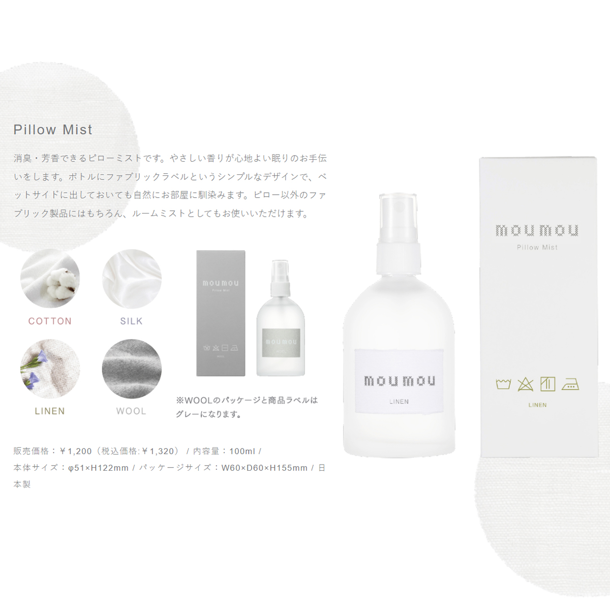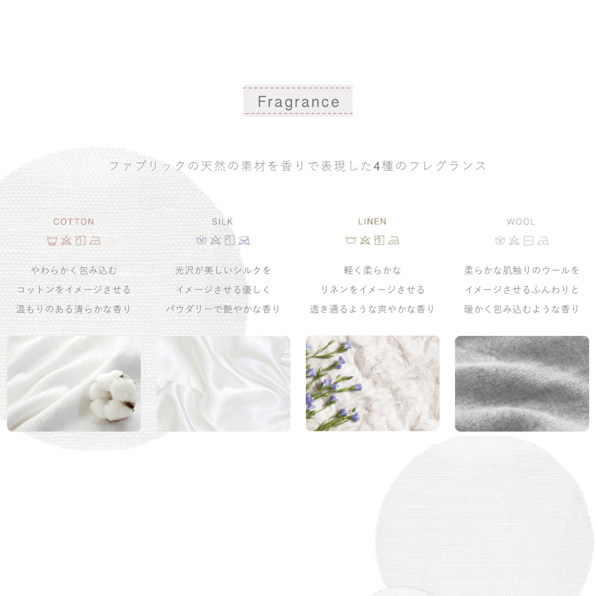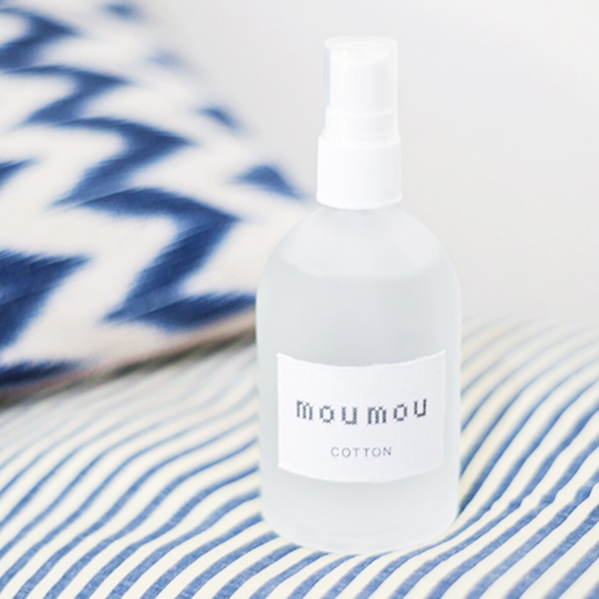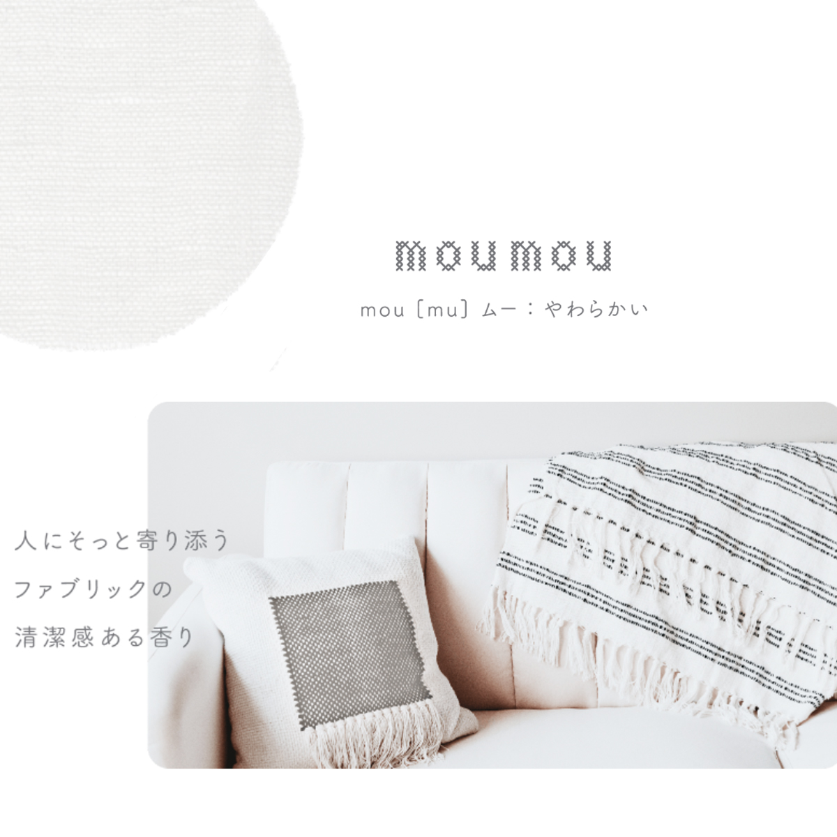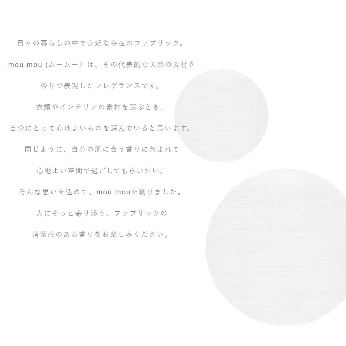 「mou」はフランス語でやわらかいという意味。 衣類やインテリアの素材を選ぶ時、きっと自分にとって心地よいものを選んでいると思います。 同じように、自分の肌に合う香りに包まれて心地よい時間や空間で過ごしてもらいたい。 そんな思いを込めて、mou mou(ムームー)は生まれました。 日々の暮らしの中でとても身近な存在であるファブリック、いろんな素材がある中で、代表的な天然素材を香りで表現しました。 人にそっと寄り添う、ファブリックの清潔感のある香りをお楽しみください。