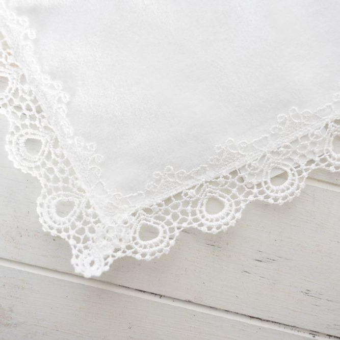 大口注文・法人のお問い合わせはこちら実用的で美しいハンカチをコンセプトに作られ、日本有数のタオル産地 今治産のタオル地を使用し、ふっくらとした肌触りが特徴的なタオルハンカチです。 表面にはパイルループをカットしたシャーリング加工を施し、ベルベットのような質感で高級感を演出しています。 タオルの周りに贅沢にあしらったレースが最大の魅力です。