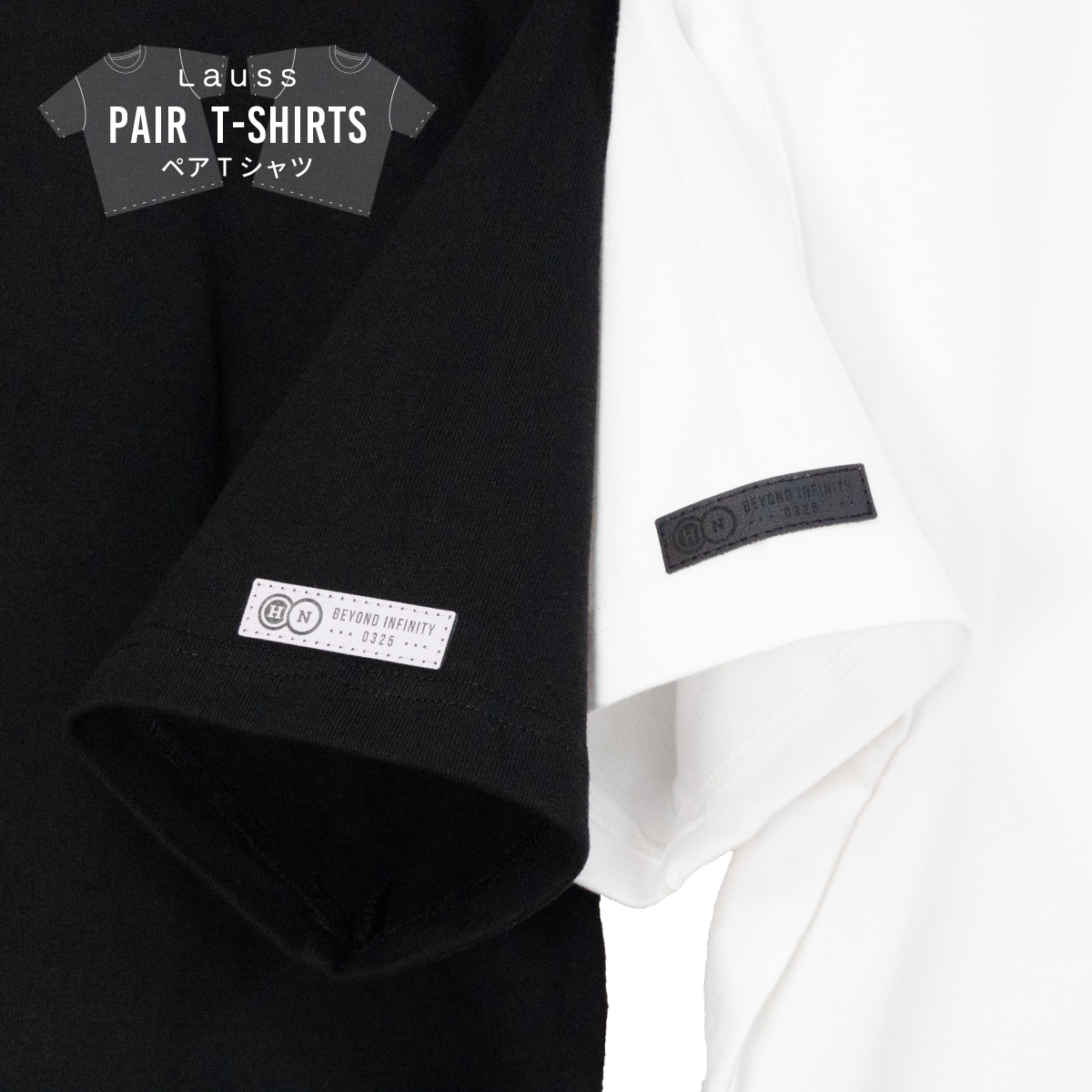 お二人のイニシャルや記念日をプリントしたレザータグをつけた、シンプルなペアTシャツです。